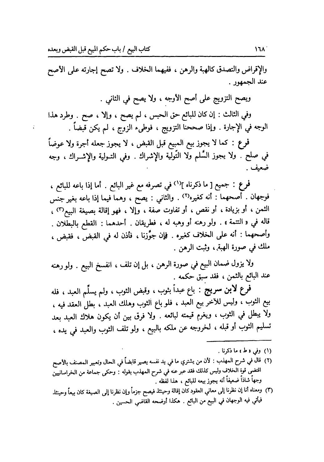 والاقراض والتصدق كالهبة والرهن، ففيهما الخلاف. ولا تصح إجارته على الاصح عند الجمهور. ويصح التزويج على أصح الاوجه، ولا يصح في الثاني. وفي الثالث: إن كان للبائع حق الحبس، لم يصح، وإلا، صح. وطرد هذا الوجه في الاجارة. وإذا صححنا التزويج، فوطئ الزوج، لم يكن قبضا. فرع كما لا يجوز بيع المبيع قبل القبض، لا يجوز جعله أجرة ولا عوضا في صلح. ولا يجوز السلم ولا التولية والاشراك. وفي التولية والاشراك، وجه ضعيف. فرع جميع ما ذكرنا، في تصرفه مع غير البائع. أما إذا باعه للبائع، فوجهان. أصحهما: أنه كغيره. والثاني: يصح، وهما فيما إذا باعه بغير جنس الثمن، أو بزيادة، أو نقص، أو تفاوت صفة، وإلا، فهو إقالة بصيغة البيع، قاله في التتمة. ولو رهنه أو وهبه له، فطريقان. أحدهما: القطع بالبطلان. وأصحهما: أنه على الخلاف كغيره. فإن جوزنا، فأذن له في القبض، فقبض، ملك في صورة الهبة، وثبت الرهن. ولا يزول ضمان البيع في صورة الرهن، بل إن تلف، انفسخ البيع. ولو رهنه عند البائع بالثمن، فقد سبق حكمه. فرع لابن سريج باع عبدا بثوب، وقبض الثوب، ولم يسلم العبد، فله بيع الثوب، وليس للآخر بيع العبد. فلو باع الثوب وهلك العبد، بطل العقد فيه، ولا يبطل في الثوب، ويغرم قيمته لبائعه. ولا فرق بين أن يكون هلاك العبد بعد تسليم الثوب أو قبله، لخروجه عن ملكه بالبيع، ولو تلف الثوب والعبد في يده،