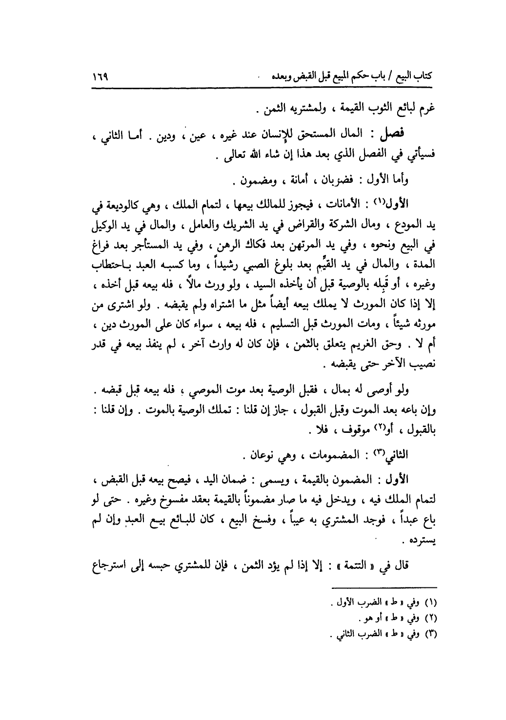 فصل المال المستحق للانسان عند غيره، عين، ودين. أما الثاني، فسيأتي في الفصل الذي بعد هذا إن شاء الله تعالى. وأما الاول: فضربان، أمانة، ومضمون. الضرب الاول: الامانات، فيجوز للمالك بيعها، لتمام الملك، وهي كالوديعة في يد المودع، ومال الشركة والقراض في يد الشريك والعامل، والمال في يد الوكيل في البيع ونحوه، وفي يد المرتهن بعد فكاك الرهن، وفي يد المستأجر بعد فراغ المدة، والمال في يد القيم بعد بلوغ الصبي رشيدا، وما كسبه العبد باحتطاب وغيره، أو قبله بالوصية قبل أن يأخذه السيد. ولو ورث مالا، فله بيعه قبل أخذه، إلا إذا كان المورث لا يملك بيعه أيضا مثل ما اشتراه ولم يقبضه. ولو اشترى من مورثه شيئا، ومات المورث قبل التسليم، فله بيعه، سواء كان على المورث دين، أم لا. وحق الغريم يتعلق بالثمن، فإن كان له وارث آخر، لم ينفذ بيعه في قدر نصيب الآخر حتى يقبضه. ولو أوصى له بمال، فقبل الوصية بعد موت الموصي، فلبيعه قبل قبضه. وإن باعه بعد الموت وقبل القبول، جاز إن قلنا: تملك الوصية بالموت. وإن قلنا: بالقبول، أو هو موقوف، فلا. الضرب الثاني: المضمونات، وهي نوعان. الاول: المضمون بالقيمة، ويسمى: ضمان اليد، فيصح بيعه قبل القبض، لتمام الملك فيه. ويدخل فيه ما صار مضمونا بالقيمة بعقد مفسوخ وغيره. حتى لو باع عبدا، فوجد المشتري به عيبا، وفسخ البيع، كان للبائع بيع العبد وإن لم يسترده، قال في التتمة: إلا إذا لم يؤد الثمن، فإن للمشتري حبسه إلى استرجاع