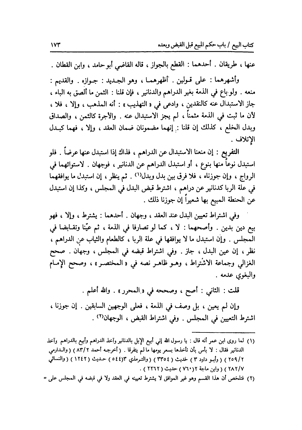 عنها، طريقان. أحدهما: القطع بالجواز، قاله القاضي أبو حامد، وابن القطان. وأشهرهما: على قولين. أظهرهما، وهو الجديد: جوازه. والقديم: منعه. ولو باع في الذمة بغير الدراهم والدنانير، فإن قلنا: الثمن ما ألصق به الباء، جاز الاستبدال عنه كالنقدين، وادعى في التهذيب: أنه المذهب، وإلا، فلا، لان ما ثبت في الذمة مثمنا، لم يجز الاستبدال عنه. والاجرة كالثمن، والصداق وبدل الخلع، كذلك إن قلنا: إنهما مضمونان ضمان العقد، وإلا، فهما كبدل الاتلاف. التفريع: إن منعنا الاستبدال عن الدراهم، فذاك إذا استبدل عنها عرضا. فلو استبدل نوعا منها بنوع، أو استبدل الدراهم عن الدنانير، فوجهان. لاستوائهما في الرواج، وإن جوزناه، فلا فرق بين بدل وبدل. ثم ينظر، إن استبدل ما يوافقهما في علة الربا كدنانير عن دراهم، اشترط قبض البدل في المجلس، وكذا إن استبدل عن الحنطة المبيع بها شعيرا إن جوزنا ذلك. وفي اشتراط تعيين البدل عند العقد، وجهان. أحدهما: يشترط، وإلا، فهو بيع دين بدين. وأصحهما: لا، كما لو تصارفا في الذمة، ثم عينا وتقابضا في المجلس. وإن استبدل ما لا يوافقها في علة الربا، كالطعام والثياب عن الدراهم، نظر، إن عين البدل، جاز. وفي اشتراط قبضه في المجلس، وجهان. صحح الغزالي وجماعة الاشتراط، وهو ظاهر نصه في المختصر، وصحح الامام والبغوي عدمه. قلت: الثاني: أصح، وصححه في المحرر. والله أعلم. وإن لم يعين، بل وصف في الذمة، فعلى الوجهين السابقين. إن جوزنا، اشترط التعيين في المجلس. وفي اشتراط القبض، الوجهان.