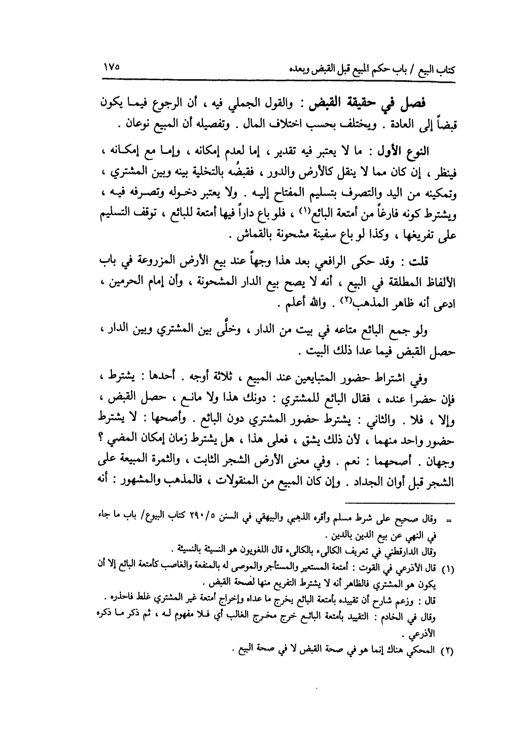 فصل في حقيقة القبض والقول الجملي فيه، أن الرجوع فيما يكون قبضا إلى العادة. ويختلف بحسب اختلاف المال. وتفصيله أن المبيع نوعان. النوع الاول: ما لا يعتبر فيه تقدير، إما لعدم إمكانه، وإما مع إمكانه، فينظر، إن كان مما لا ينقل كالارض والدور، فقبضه بالتخلية بينه وبين المشتري، وتمكينه من اليد والتصرف بتسليم المفتاح إليه. ولا يعتبر دخوله وتصرفه فيه، ويشترط كونه فارغا من أمتعة البائع، فلو باع دارا فيها أمتعة للبائع، توقف التسليم على تفريغها، وكذا لو باع سفينة مشحونة بالقماش. قلت: وقد حكى الرافعي بعد هذا وجها عند بيع الارض المزروعة في باب الالفاظ المطلقة في البيع، أنه لا يصح بيع الدار المشحونة، وأن إمام الحرمين، ادعى أنه ظاهر المذهب. والله أعلم. ولو جمع البائع متاعه في بيت من الدار، وخلى بين المشتري وبين الدار، حصل القبض فيما عدا ذلك البيت. وفي اشتراط حضور المتبايعين عند المبيع، ثلاثة أوجه. أحدها: يشترط، فإن حضرا عنده، فقال البائع للمشتري: دونك هذا ولا مانع، حصل القبض، وإلا، فلا. والثاني: يشترط حضور المشتري دون البائع. وأصحها: لا يشترط حضور واحد منهما، لان ذلك يشق. فعلى هذا هل يشترط زمان إمكان المضي ؟ وجهان. أصحهما: نعم. وفي معنى الارض الشجر الثابت، والثمرة المبيعة على ا لشجر قبل أوان الجداد. وإن كان المبيع من المنقولات، فالمذهب والمشهور: أنه
