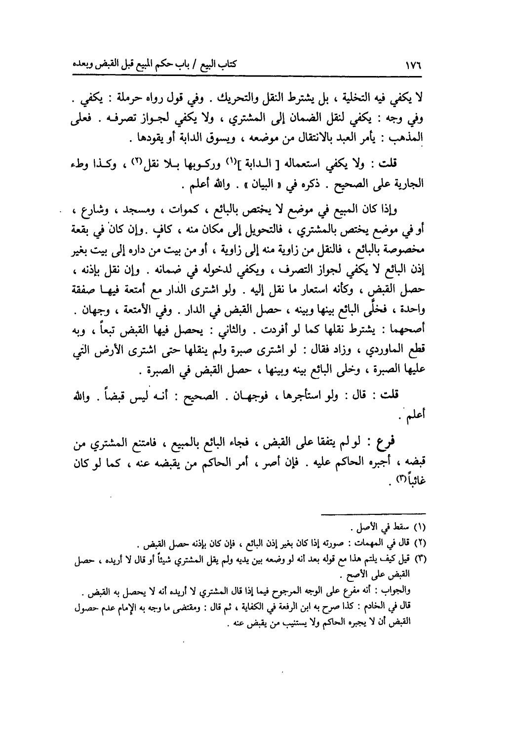 لا يكفي فيه التخلية، بل يشترط النقل والتحريك. وفي قول رواه حرملة: يكفي. وفي وجه: يكفي لنقل الضمان إلى المشتري، ولا يكفي لجواز تصرفه. فعلى المذهب: يأمر العبد بالانتقال من موضعه، ويسوق الدابة أو يقودها. قلت: ولا يكفي استعماله الدابة وركوبها بلا نقل، وكذا وطئ الجارية على الصحيح. ذكره في البيان. والله أعلم. وإذا كان المبيع في موضع لا يختص بالبائع، كموات، ومسجد، وشارع، أو في موضع يختص بالمشتري، فالتحويل إلى مكان منه، كاف. وإن كان في بقعة مخصوصة بالبائع، فالنقل من زاوية منه إلى زاوية، أو من بيت من داره إلى بيت بغير إذن البائع لا يكفي لجواز التصرف، ويكفي لدخوله في ضمانه. وإن نقل بإذنه، حصل القبض، وكأنه استعار ما نقل إليه. ولو اشترى الدار مع أمتعة فيها صفقة واحدة، فخلى البائع بينها وبينه، حصل القبض في الدار. وفي الامتعة، وجهان. أصحهما: يشترط نقلها كما لو أفردت. والثاني: يحصل فيها القبض تبعا، وبه قطع الماوردي وزاد فقال: لو اشترى صبرة ولم ينقلها حتى اشترى الارض التي عليها الصبرة، وخلى البائع بينه وبينها، حصل القبض في الصبرة. قلت: قال: ولو استأجرها، فوجهان. الصحيح: أنه ليس قبضا. والله أعلم. فرع لو لم يتفقا على القبض، فجاء البائع بالمبيع، فامتنع المشتري من قبضه، أجبره الحاكم عليه. فإن أصر، أمر الحاكم من يقبضه عنه، كما لو كان غائبا.