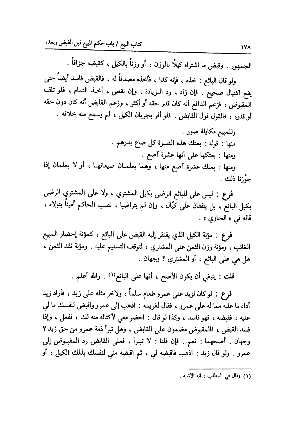 الجمهور. وقبض ما اشتراه كيلا بالوزن، أو وزنا بالكيل، كقبضه جزافا. ولو قال البائع: خذه، فإنه كذا، فأخذه مصدقا له، فالقبض فاسد أيضا حتى يقع اكتيال صحيح. فإن زاد، رد الزيادة. وأن نقص، أخذ التمام. فلو تلف المقبوض، فزعم الدافع أنه كان قدر حقه أو أكثر، وزعم القابض أنه كان دون حقه أو قدره، فالقول قول القابض. فلو أقر بجريان الكيل، لم يسمع منه خلافه. وللمبيع مكايلة صور. منها: قوله: بعتك هذه الصبرة كل صاع بدرهم. ومنها: بعتكها على أنها عشرة آصع. ومنها: بعتك عشرة آصع منها، وهما يعلمان صيعانها، أو لا يعلمان إذا جوزنا ذلك. فرع ليس على البائع الرضى بكيل المشتري، ولا على المشتري الرضى بكيل البائع، بل يتفقان على كيال، وإن لم يتراضيا، نصب الحاكم أمينا يتولاه، قاله في الحاوي فرع مؤنة الكيل الذي يفتقر إليه القبض على البائع، كمؤنة إحضار المبيع الغائب، ومؤنة وزن الثمن على المشتري، لتوقف التسليم عليه. ومؤنة نقد الثمن هل على البائع، أو المشتري ؟ وجهان. قلت: ينبغي أن يكون الاصح، أنها على البائع. والله أعلم. فرع لو كان لزيد على عمرو طعام سلما، ولآخر مثله على زيد، فأراد زيد أداء ما عليه مما له على عمرو، فقال لغريمه: اذهب إلى عمرو واقبض لنفسك ما لي عليه، فقبضه، فهو فاسد، وكذا لو قال: احضر معي لاكتاله منه لك، ففعل. وإذا فسد القبض، فالمقبوض مضمون على القابض. وهل تبرأ ذمة عمرو من حق زيد ؟ وجهان. أصحهما: نعم. فإن قلنا: لا تبرأ، فعلى القابض رد المقبوض إلى عمرو. ولو قال زيد: اذهب فاقبضه لي، ثم اقبضه مني لنفسك بذلك الكيل، أو