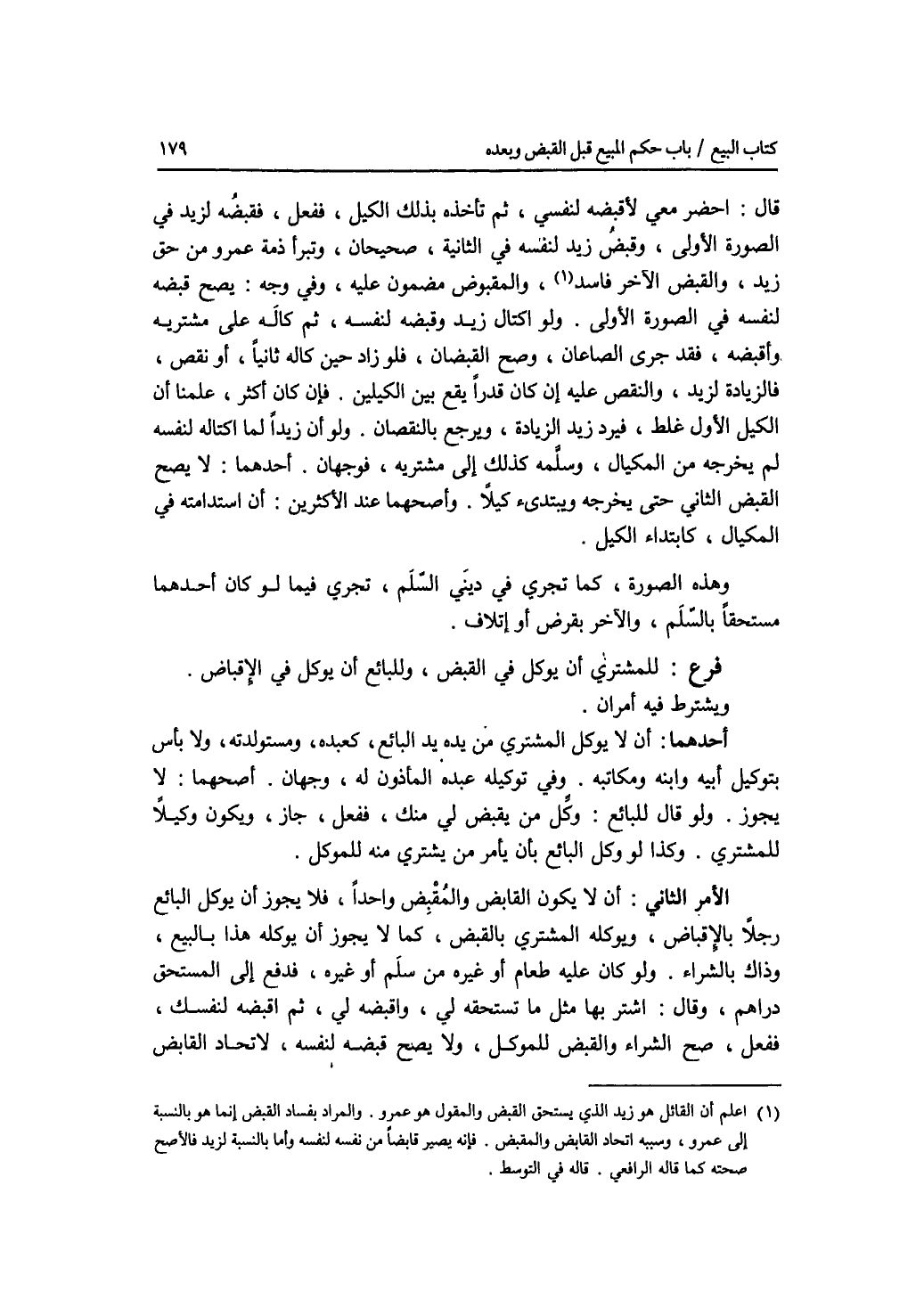 قال: احضر معي لاقبضه لنفسي، ثم تأخذه بذلك الكيل، ففعل، فقبضه لزيد في الصورة الاولى، وقبض زيد لنفسه في الثانية، صحيحان، وتبرأ ذمة عمرو من حق زيد، والقبض الآخر فاسد، والمقبوض مضمون عليه. وفي وجه: يصح قبضه لنفسه في الصورة الاولى. ولو اكتال زيد وقبضه لنفسه، ثم كاله على مشتري وأقبضه، فقد جرى الصاعان، وصح القبضان. فلو زاد حين كاله ثانيا، أو نقص، فالزيادة لزيد، والنقص عليه إن كان قدرا يقع بين الكيلين. فإن كان أكثر، علمنا أن الكيل الاول غلط، فيرد زيد الزيادة، ويرجع بالنقصان. ولو أن زيدا لما اكتاله لنفسه لم يخرجه من المكيال، وسلمه كذلك إلى مشتريه، فوجهان. أحدهما: لا يصح القبض الثاني حتى يخرجه ويبتدئ كيلا. وأصحهما عند الاكثرين: أن استدامته في المكيال، كابتداء الكيل. وهذه الصورة، كما تجري في ديني السلم، تجري فيما لو كان أحدهما مستحقا بالسلم، والآخر بقرض أو إتلاف. فرع للمشتري أن يوكل في القبض، وللبائع أن يوكل في الاقباض، ويشترط فيه أمران. أحدهما: أن لا يوكل المشتري من يده يد البائع، كعبده، ومستولدته، ولا بأس بتوكيل أبيه وابنه ومكاتبه. وفي توكيله عبده المأذون له، وجهان. أصحهما: لا يجوز. ولو قال للبائع: وكل من يقبض لي منك، ففعل، جاز، ويكون وكيلا للمشتري. وكذا لو وكل البائع بأن يأمر من يشتري منه للموكل. الامر الثاني: أن لا يكون القابض والمقبض واحدا، فلا يجوز أن يوكل البائع رجلا بالاقباض، ويوكله المشتري بالقبض. كما لا يجوز أن يوكله هذا بالبيع، وذاك بالشراء. ولو كان عليه طعام أو غيره من سلم أو غيره، فدفع إلى المستحق دراهم، وقال: اشتر بها مثل ما تستحقه لي، واقبضه لي، ثم اقبضه لنفسك، ففعل، صح الشراء والقبض للموكل، ولا يصح قبضه لنفسه، لاتحاد القابض