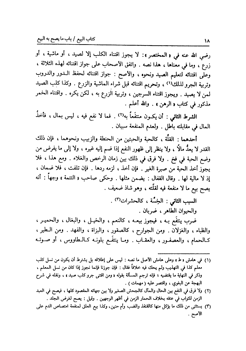 رضي الله عنه في المختصر: لا يجوز اقتناء الكلب إلا لصيد، أو ماشية، أو زرع، وما في معناها، هذا نصه. واتفق الاصحاب على جواز اقتنائه لهذه الثلاثة، وعلى اقتنائه لتعليم الصيد ونحوه، والاصح: جواز اقتنائه لحفظ الدور والدروب وتربية الجرو لذلك، وتحريم اقتنائه قبل شراء الماشية الزرع. وكذا كلب الصيد لمن لا يصيد. ويجوز اقتناء السرجين، وتربية الزرع به، لكن يكره. واقتناء الخمر مذكوذ في كتاب الرهن. والله أعلم. الشرط الثاني: أن يكون منتفعا به. فما لا نفع فيه، ليس بمال، فأخذ المال في مقابلته باطل. ولعدم المنفعة سببان. أحدهما: القلة، كالحبة والحبتين من الحنطة والزبيب ونحوهما، فإن ذلك القدر لا يعد مالا، ولا ينظر إلى ظهور النفع إذا ضم إليه غيره، ولا إلى ما يفرض من وضع الحبة في فخ. ولا فرق في ذلك بين زمان الرخص والغلاء. ومع هذا، فلا يجوز أخذ الحبة من صبرة الغير. فإن أخذ، لزمه ردها. فإن تلفت، فلا ضمان، إذ لا مالية لها. وقال القفال: يضمن مثلها. وحكى صاحب التتمة وجها: أنه يصح بيع مالا منفعة فيه لقلته، وهو شاذ ضعيف. السبب الثاني: الخسة، كالحشرات. والحيوان الطاهر، ضربان، ضرب ينتفع به، فيجوز بيعه، كالنعم، والخيل، والبغال، والحمير، والظباء، والغزلان. ومن الجوارح، كالصقور، والبزاة، والفهد. ومن الطير، كالحمام، والعصفور، والعقاب. وما ينتفع بلونه كالطاووس، أو صوته