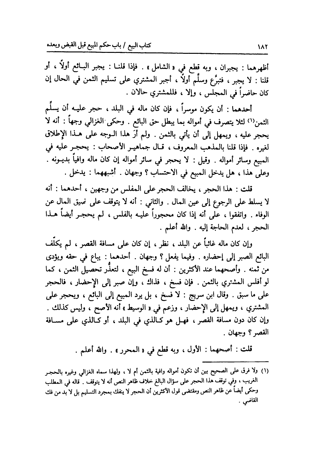 أظهرهما: يجبران، وبه قطع في الشامل. فإذا قلنا: يجبر البائع أولا، أو قلنا: لا يجبر، فتبرع، وسلم أولا، أجبر المشتري على تسليم الثمن في الحال إن كان حاضرا في المجلس، وإلا، فللمشتري حالان. أحدهما: أن يكون موسرا، فإن كان ماله في البلد، حجر عليه أن يسلم الثمن، لئلا يتصرف في أمواله بما يبطل حق البائع. وحكى الغزالي وجها: أنه لا يحجر عليه، ويمهل إلى أن يأتي بالثمن. ولم أر هذا الوجه على هذا الاطلاق لغيره. فإذا قلنا بالمذهب المعروف، قال جماهير الاصحاب: يحجر عليه في المبيع وسائر أمواله. وقيل: لا يحجر في سائر أمواله إن كان ماله وافيا بديونه. وعلى هذا، هل يدخل المبيع في الاحتساب ؟ وجهان. أشبههما: يدخل. قلت: هذا الحجر، يخالف الحجر على المفلس من وجهين، أحدهما: أنه لا يسلط على الرجوع إلى عين المال. والثاني: أنه لا يتوقف على ضيق المال عن الوفاء. واتفقوا، على أنه إذا كان محجورا عليه بالفلس، لم يحجر أيضا هذا الحجر، لعدم الحاجة إليه. والله أعلم. وإن كان ماله غائبا عن البلد، نظر، إن كان على مسافة القصر، لم يكلف البائع الصبر إلى إحضاره. وفيما يفعل ؟ وجهان. أحدهما: يباع في حقه ويودى من ثمنه. وأصحهما عند الاكثرين: أن له فسخ البيع، لتعذر تحصيل الثمن، كما لو أفلس المشتري بالثمن. فإن فسخ، فذاك، وإن صبر إلى الاحضار، فالحجر على ما سبق. وقال ابن سريج: لا فسخ، بل يرد المبيع إلى البائع، ويحجر على المشتري، ويمهل إلى الاحضار، وزعم في الوسيط أنه الاصح، وليس كذلك. وإن كان دون مسافة القصر، فهل هو كالذي في البلد، أو كالذي على مسافة القصر ؟ وجهان. قلت: أصحهما: الاول، وبه قطع في المحرر. والله أعلم.