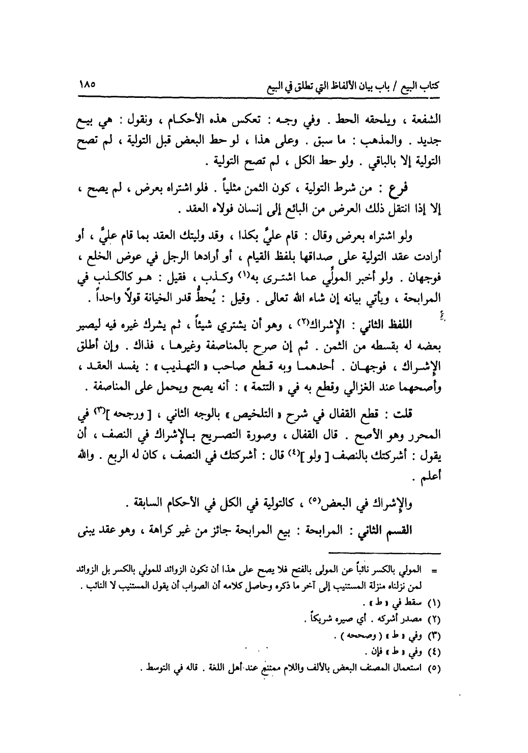 الشفعة، ويلحقه الحط. وفي وجه: تعكس هذه الاحكام، ونقول: هي بيع جديد. والمذهب: ما سبق. وعلى هذا، لو حط البعض قبل التولية، لم تصح التولية إلا بالباقي. ولو حط الكل، لم تصح التولية. فرع من شرط التولية، كون الثمن مثليا. فلو اشتراه بعرض، لم يصح، إلا إذا انتقل ذلك العرض من البائع إلى إنسان فولاه العقد. ولو اشتراه بعرض وقال: قام علي بكذا، وقد وليتك العقد بما قام علي، أو أرادت عقد التولية على صداقها بلفظ القيام، أو أرادها الرجل في عوض الخلع، فوجهان. ولو أخبر المولي عما اشترى وكذب، فقيل: هو كالكذب في المرابحة، ويأتي بيانه إن شاء الله تعالى. وقيل: يحط قدر الخيانة قولا واحدا. اللفظ الثاني: الاشراك، وهو أن يشتري شيئا، ثم يشرك غيره فيه ليصير بعضه له بقسطه من الثمن. ثم إن صرح بالمناصفة وغيرها، فذاك. وإن أطلق الاشراك، فوجهان. أحدهما وبه قطع صاحب التهذيب: يفسد العقد، وأصحهما عند الغزالي وقطع به في التتمة: أنه يصح ويحمل على المناصفة. قلت: قطع القفال في شرح التلخيص بالوجه الثاني، وصححه في المحرر وهو الاصح. قال القفال، وصورة التصريح بالاشراك في النصف، أن يقول: أشركتك بالنصف. فإن قال: أشركتك في النصف، كان له الربع. والله أعلم. والاشراك في البعض، كالتولية في الكل في الاحكام السابقة. القسم الثاني: المرابحة: بيع المرابحة جائز من غير كراهة، وهو عقد يبنى