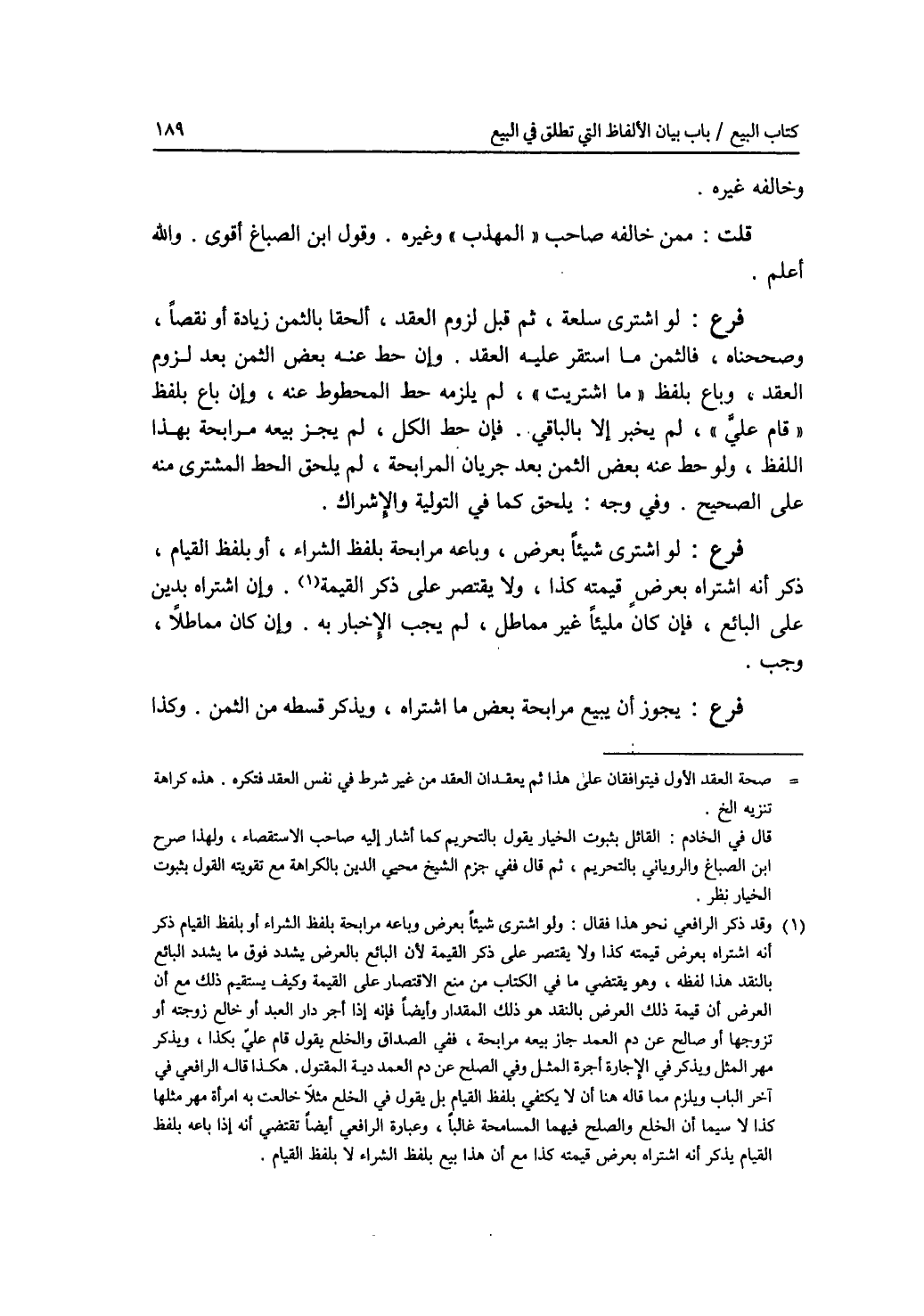 وخالفه غيره. قلت: ممن خالفه صاحب المهذب وغيره. وقول ابن الصباغ أقوى. والله أعلم. فرع لو اشترى سلعة، ثم قبل لزوم العقد، ألحقا بالثمن زيادة أو نقصا، وصححناه، فالثمن ما استقر عليه العقد. وإن حط عنه بعض الثمن بعد لزوم العقد، وباع بلفظ ما اشتريت، لم يلزمه حط المحطوط عنه، وإن باع بلفظ قام علي، لم يخبر إلا بالباقي. فإن حط الكل، لم يجز بيعه مرابحة بهذا اللفظ، ولو حط عنه بعض الثمن بعد جريان المرابحة، لم يلحق الحط المشترى منه على الصحيح. وفي وجه: يلحق كما في التولية والاشراك. فرع لو اشترى شيئا بعرض، وباعه مرابحة بلفظ الشراء، أو بلفظ القيام، ذكر أنه اشتراه بعرض قيمته كذا، ولا يقتصر على ذكر القيمة. وإن اشتراه بدين على البائع، فإن كان مليئا غير مماطل، لم يجب الاخبار به. وإن كان مماطلا، وجب. فرع يجوز أن يبيع مرابحة بع ض ما اشتراه، ويذكر قسطه من الثمن. وكذا