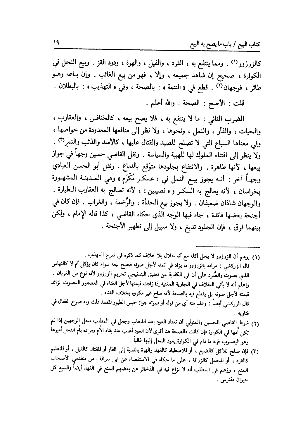 كالزرزور. ومما ينتفع به، القرد، والفيل، والهرة، ودود القز. وبيع النحل في الكوارة، صحيح إن شاهد جميعه، وإلا، فهو من بيع الغائب. وإن باعه وهو طائر، فوجهان. قطع في التتمة: بالصحة، وفي التهذيب: بالبطلان. قلت: الاصح: الصحة. والله أعلم. الضرب الثاني: ما لا ينتفع به، فلا يصح بيعه، كالخنافس، والعقارب، والحيات، والفأر، والنمل، ونحوها، ولا نظر إلى منافعها المعدودة من خواصها، وفي معناها السباع التي لا تصلح للصيد والقتال عليها، كالاسد والذئب والنمر. ولا ينظر إلى اقتناء الملوك لها للهيبة والسياسة. ونقل القاضي حسين وجها في جواز بيعها، لانها طاهرة. والانتفاع بجلودها متوقع بالدباغ. ونقل أبو الحسن العبادي وجها آخر: أنه يجوز بيع النمل في عسكر مكرم وهي المدينة المشهورة بخراسان، لانه يعالج به السكر، ونصيبين، لانه تعالج به العقارب الطيارة. والوجهان شاذان ضعيفان. ولا يجوز بيع الحدأة، والرخمة، والغراب. فإن كان في أجنحة بعضها فائدة، جاء فيها الوجه الذي حكاه القاضي، كذا قاله الامام، ولكن بينهما فرق، فإن الجلود تدبغ، ولا سبيل إلى تطهير الاجنحة.