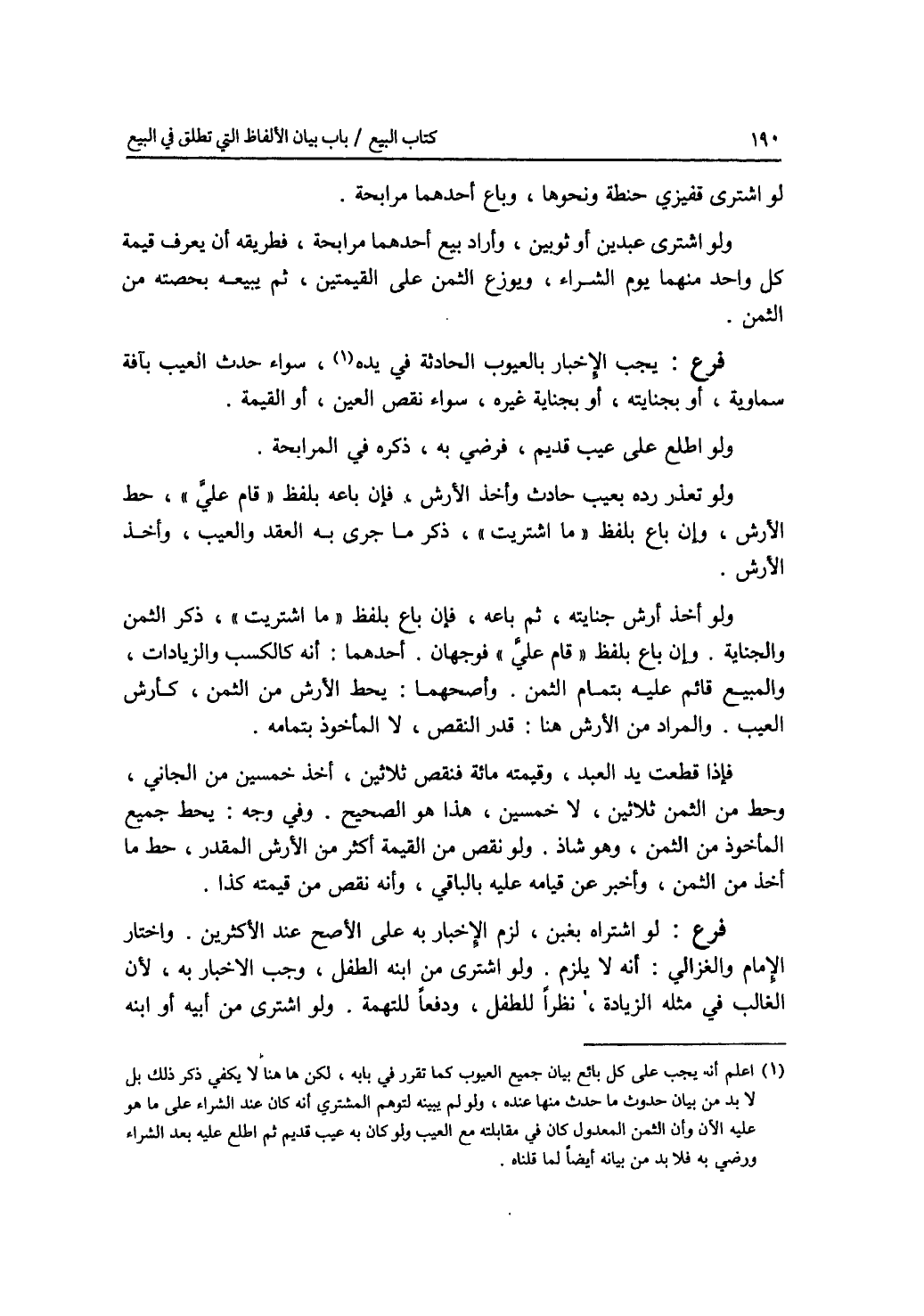 لو اشترى قفيزي حنطة ونحوها، وباع أحدهما مرابحة. ولو اشترى عبدين أو ثوبين، وأراد بيع أحدهما مرابحة، فطريقه أن يعرف قيمة كل واحد منهما يوم الشراء، ويوزع الثمن على القيمتين، ثم يبيعه بحصته من الثمن. فرع يجب الاخبار بالعيوب الحادثة في يده، سواء حدث العيب بآفة سماوية، أو بجنايته، أو بجناية غيره، سواء نقص العين، أو القيمة. ولو اطلع على عيب قديم، فرضي به، ذكره في المرابحة. ولو تعذر رده بعيب حادث وأخذ الارش، فإن باعه بلفظ قام علي، حط الارش، وإن باع بلفظ ما اشتريت، ذكما جرى به العقد والعيب، وأخذ الارش. ولو أخذ أرش جنايته، ثم باعه، فإن باع بلفظ ما اشتريت، ذكر الثمن والجناية. وإن باع بلفظ قام علي فوجهان. أحدهما: أنه كالكسب والزيادات، والمبيع قائم عليه بتمام الثمن. وأصحهما: يحط الارش من الثمن، كأرش العيب. والمراد من الارش هنا: قدر النقص، لا المأخوذ بتمامه. فإذا قطعت يد العبد، وقيمته مائة فنقص ثلاثين، أخذ خمسين من الجاني، وحط من الثمن ثلاثين، لا خمسين، هذا هو الصحيح. وفي وجه: يحط جميع المأخوذ من الثمن، وهو شاذ. ولو نقص من القيمة أكثر من الارش المقدر، حط ما أخذ من الثمن، وأخبر عن قيامه عليه بالباقي، وأنه نقص من قيمته كذا. فرع لو اشتراه بغبن، لزم الاخبار به على الاصح عند الاكثرين. واختار الامام والغزالي: أنه لا يلزم. ولو اشترى من ابنه الطفل، وجب الاخبار به، لان الغالب في مثله الزيادة، نظرا للطفل، ودفعا للتهمة. ولو اشترى من أبيه أو إبنه