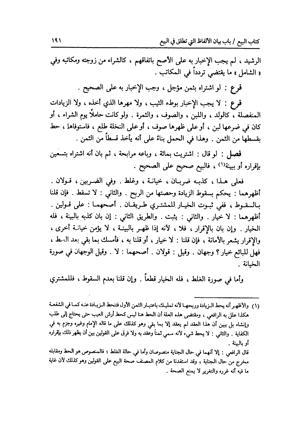 الرشيد، لم يجب الاخبار به على الاصح باتفاقهم، كالشراء من زوجته ومكاتبه. وفي الشامل ما يقتضي ترددا في المكاتب. فرع لو اشتراه بثمن مؤجل، وجب الاخبار به على الصحيح. فرع لا يجب الاخبار بوطئ الثيب، ولا مهرها الذي أخذه، ولا الزيادات المنفصلة، كالولد، واللبن، والصوف، والثمرة. ولو كانت حاملا يوم الشراء، أو كان في ضرعها لبن، أو على ظهرها صوف، أو على النخلة طلع، فاستوفاها، حط بقسطها من الثمن. وهذا في الحمل بناء على أنه يأخذ قسطا من الثمن. فصل لو قال: اشتريت بمائة، وباعه مرابحة، ثم بان أنه اشتراه بتسعين بإقراره أو ببينة، فالبيع صحيح على الصحيح. فعلى هذا، كذبه ضربان، خيانة، وغلط. وفي الضربين، قولان. أظهرهما: يحكم بسقوط الزيادة وحصتها من الربح. والثاني: لا تسقط. فإن قلنا بالسقوط، ففي ثبوت الخيار للمشتري طريقان. أصحهما: على قولين. أظهرهما: لا خيار. والثاني: يثبت. والطريق الثاني: إن بان كذبه بالبينة، فله الخيار. وإن بان بالاقرار، فلا، لانه إذا ظهر بالبينة، لا يؤمن خيانة أخرى، والاقرار يشعر بالامانة. فإن قلنا: لا خيار، أو قلنا به، فأمسك بما بقي بعد الحط، فهل للبائع خيار ؟ وجهان. وقيل: قولان. أصحهما: لا. وقيل الوجهان في صورة الخيانة. وأما في صورة الغلط، فله الخيار قطعا. وإن قلنا بعدم السقوط، فللمشتري