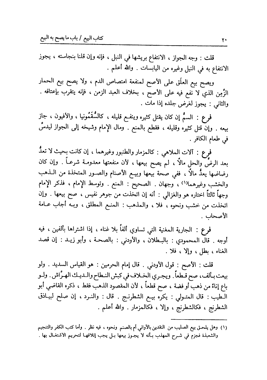 قلت: وجه الجواز، الانتفاع بريشها في النبل، فانه وإن قلنا بنجاسته، يجوز الانتفاع به في النبل وغيره من اليابسات. والله أعلم. ويصح بيع العلق على الاصح لمنفعته امتصاص الدم، ولا يصح بيع الحمار الزمن الذي لا نفع فيه على الاصح، بخلاف العبد الزمن، فإنه يتقرب بإعتاقه. والثاني: يجوز لغرض جلده إذا مات. فرع السم إن كان يقتل كثيره وينفع قليله، كالسقمونيا، والافيون، جاز بيعه. وإن قتل كثيره وقليله، فقطع بالمنع. ومال الامام وشيخه إلى الجواز ليدس في طعام الكافر. فرع آلات الملاهي: كالمزمار والطنبور وغيرهما، إن كانت بحيث لا تعد بعد الرض والحل مالا، لم يصح بيعها، لان منفعتها معدومة شرعا. وإن كان رضاضها يعد مالا، ففي صحة بيعها وبيع الاصنام والصور المتخذة من الذهب والخشب وغيرهما، وجهان. الصحيح: المنع. وتوسط الامام، فذكر الامام وجها ثالثا اختاره هو والغزالي: أنه إن اتخذت من جوهر نفيس، صح بيعها. وإن اتخذت من خشب ونحوه، فلا، والمذهب: المنع المطلق، وبه أجاب عامة الاصحاب. فرع الجارية المغنية التي تساوي ألفا بلا غناء، إذا اشتراها بألفين، فيه أوجه. قال المحمودي: بالبطلان، والاودني: بالصحة، وأبو زيد: إن قصد الغناء، بطل، وإلا، فلا. قلت: الاصح: قول الاودني. قال إمام الحرمين: هو القياس السديد ولو بيعت بألف، صح قطعا. ويجري الخلاف في كبش النطاح والديك الهراش. ولو باع إناء من ذهب أو فضة، صح قطعا، لان المقصود الذهب فقط، ذكره القاضي أبو الطيب: قال المتولي: يكره بيع الشطرنج. قال: والنرد، إن صلح لبياذق الشطرنج، فكالشطرنج، وإلا، فكالمزمار. والله أعلم.