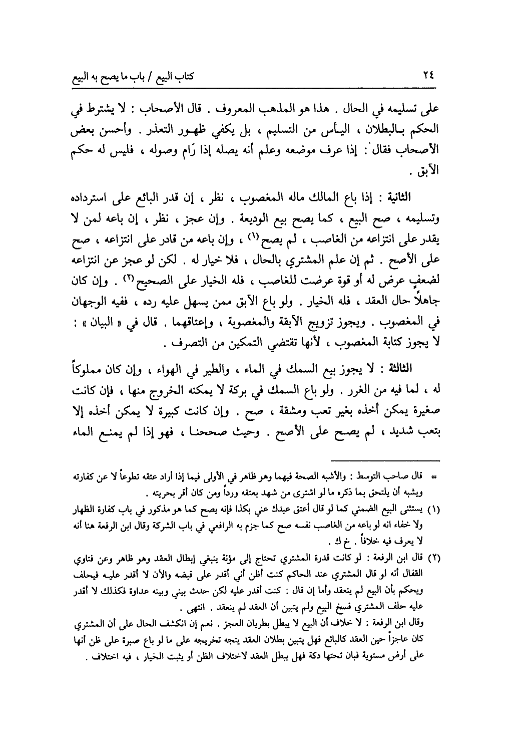 على تسليمه في الحال. هذا هو المذهب المعروف. قال الاصحاب: لا يشترط في الحكم بالبطلان، اليأس من التسليم، بل يكفي ظهور التعذر. وأحسن بعض الاصحاب فقال: إذا عرف موضعه وعلم أنه يصله إذارام وصوله، فليس له حكم الآبق. الثانية: إذا باع المالك ماله المغصوب، نظر، إن قدر البائع على استرداده وتسلمه، صح البيع، كما يصح بيع الوديعة. وإن عجز، نظر، إن باعه لمن لا يقدر على انتزاعه من الغاصب، لم يصح. وإن باعه من قادر على انتزاعه، صح على الاصح. ثم إن علم المشتري بالحال، فلا خيار له. لكن لو عجز عن انتزاعه لضعف عرض له أو قوة عرضت للغاصب، فله الخيار على الصحيح. وإن كان جاهلا حال العقد، فله الخيار. ولو باع الآبق ممن يسهل عليه رده، ففيه الوجهان في المغصوب. ويجوز تزويج الآبقة والمغصوبة، وإعتاقهما. قال في البيان: لا يجوز كتابة المغصوب، لانها تقتضي التمكين من التصرف. الثالثة: لا يجوز بيع السمك في الماء، والطير في الهواء، وإن كان مملوكا له، لما فيه من الغرر. ولو باع السمك في بركة لا يمكنه الخروج منها، فإن كانت صغيرة يمكن أخذه بغير تعب ومشقة، صح. وإن كانت كبيرة لا يمكن أخذه إلا بتعب شديد، لم يصح على الاصح. وحيث صححنا، فهو إذا لم يمنع الماء