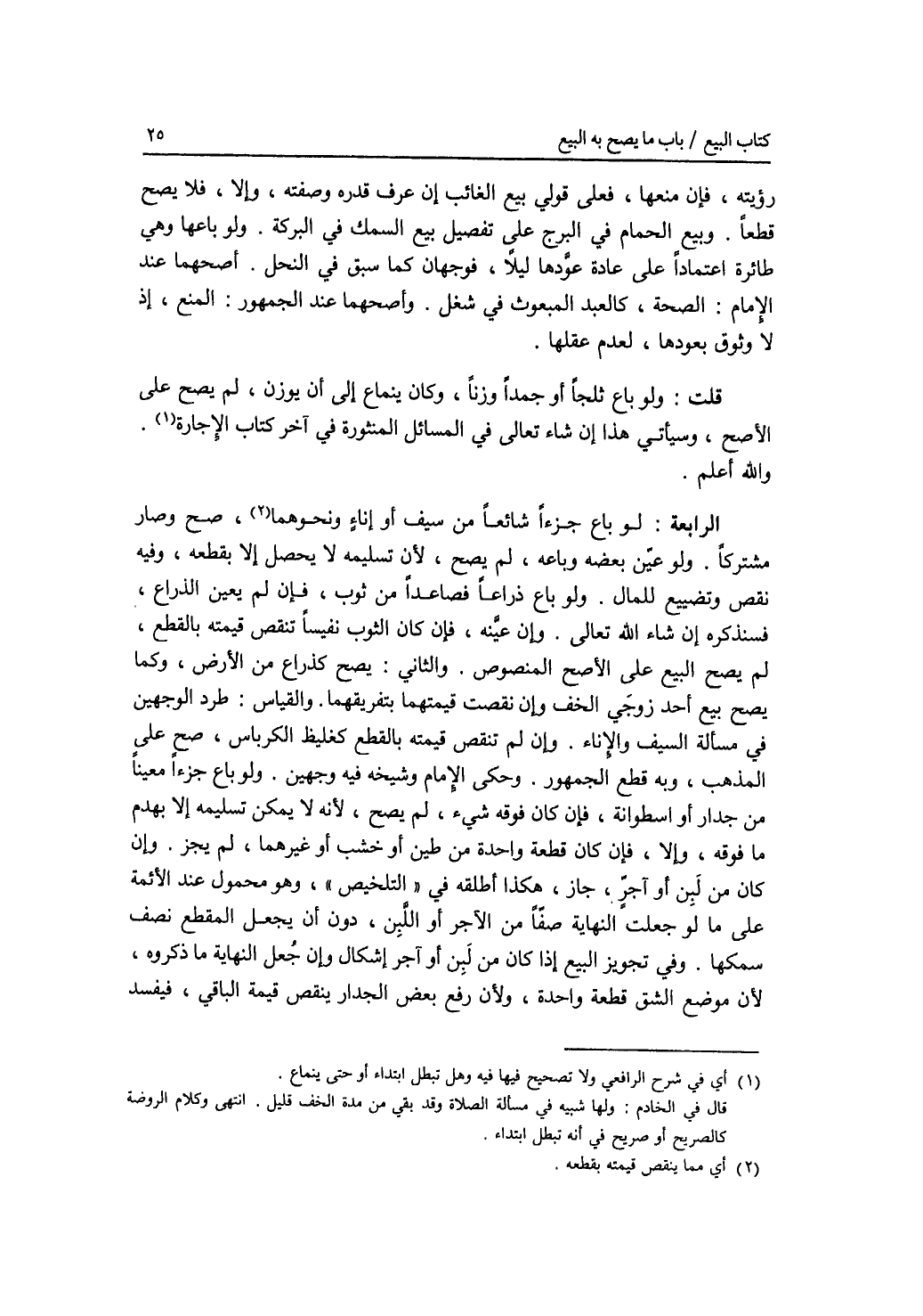 رؤيته، فإن منعها، فعلى قولي بيع الغائب إن عرف قدره وصفته، وإلا، فلا يصح قطعا. وبيع الحمام في البرج على تفصيل بيع السمك في البركة. ولو باعها وهي طائرة اعتمادا على عادة عودها ليلا، فوجهان كما سبق في النحل. أصحهما عند الامام: الصحة، كالعبد المبعوث في شغل. وأصحهما عند الجمهور: المنع، إذ لا وثوف بعودها، لعدم عقلها. قلت: ولو باع ثلجا أو جمدا وزنا، وكان ينماع إلى أن يوزن، لم يصح على الاصح، وسيأتي هذا إن شاء الله تعالى في المسائل المنثورة في آخر كتاب الاجارة. والله أعلم. الرابعة: لو باع جزءا شائعا من سيف أو إناء ونحوهما، صح وصار مشتركا. ولو عين بعضه وباعه، لم يصح، لان تسليمه لا يحصل إلا بقطعه، وفيه نقص وتضييع للمال. ولو باع ذراعا فصاعدا من ثوب، فإن لم يعين الذراع، فسنذكره ان شاء الله تعالى. وان عينه، فان كان الثوب نفيسا تنقض قيمته بالقتع، لم يصح البيع على الاصح المنصوص. والثانى: يصح كذراع من الارض، وكما في مسالة السيف والاناء. وان لم تنقص قيمته بالقطع كغليظ الكرباس، صح على