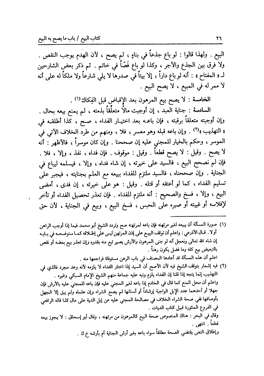 الخامسة: لا يصح بيع المرهون بعد الاقباض قبل الفكاك. السادسة: جناية، إن أوجبت مالا متعلقا بذمته، لم يمنع بيعه بحال. وإن أوجبته متعلقا برقبته، فإن باعه بعد اختيار الفداء، صح، كذا أطلقه في التهذيب. وإن باعه قبله وهو معسر، فلا، ومنهم من طرد الخلاف الآتي في الموسر، وحكم بالخيار للمجني عليه إن صححنا. وإن كان موسرا، فالاظهر: أنه لا يصح. وقيل: لا يصح قطعا. وقيل: موقوف. فإن فداه، نفذ، وإلا، فلا. فإن لم نصحح البيع، فالسيد على خيرته، إن شاء فداه، وإلا، فيسلمه ليباع في الجناية. وإن صححناه، فالسيد ملتزم للفداء ببيعه مع العلم بجنايته، فيجبر على تسليم الفداء، كما لو أعتقه أو قتله. وقيل: هو على خيرته، إن فدى، أمضى البيع، وإلا، فسخ والصحيح: أنه ملتزللفداء. فإن تعذر تحصيل الفداء أو تأخر لافلاسه أو غيبته أو صبره على الحبس، فسخ البيع، وبيع في الجناية، لان حق