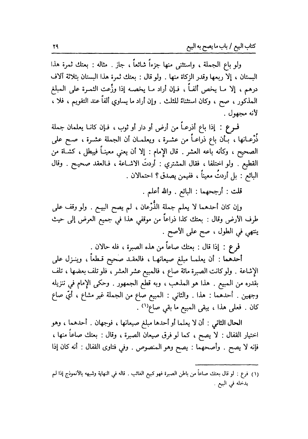 ولو باع الجملة، واستثنى منها جزءا شائعا، جاز. مثاله: بعتك ثمرة هذا البستان، إلا ربعها وقدر الزكاة منها. ولو قال: بعتك ثمرة هذا البستان بثلاثة آلاف درهم، إلا ما يخص ألفا، فإن أراد ما يخصه إذا وزعت الثمرة على المبلغ المذكور، صح، وكان استثناء للثلث. وإن أراد ما يساوي ألفا عند التقويم، فلا، لانه مجهول. فرع إذا باع أذرعا من أرض أو دار أو ثوب، فإن كانا يعلمان جملة ذرعانها، بأن باع ذراعا من عشرة، ويعلمان أن الجملة عشرة، صح على الصحيح، وكأنه باعه العشر. قال الامام: إلا أن يعني معينا فيبطل، كشاة من القطيع. ولو اختلفا، فقال المشتري: أردت الاشاعة، فالعقد صحيح. وقال البائع: بل أردت معينا، ففيمن يصدق ؟ احتمالان. قلت: أرجحهما: البائع. والله أعلم. وإن كان أحدهما لا يعلم جملة الذرعان، لم يصح البيع. ولو وقف على طرف الارض وقال: بعتك كذا ذراعا من موقفي هذا في جميع العرض إلى حيث ينتهي في الطول، صح على الاصح. فرع إذا قال: بعتك صاعا من هذه الصبرة، فله حالان. أحدهما: أن يعلما مبلغ صيعانها فالعقد صحيح قطعا، وينزل على الاشاعة. ولو كانت الصبرة مائة صاع، فالمبيع عشر العشر، فلو تلف بعضها، تلف بقدره من المبيع. هذا هو المذهب، وبه قطع الجمهور. وحكى الامام في تنزيله وجهين. أحدهما: هذا. والثاني: المبيع صاع من الجملة غير مشاع، أي صاع كان. فعلى هذا، يبقى المبيع ما بقي صاع. الحال الثاني: أن لا يعلما أو أحجها مبلغ صيعانها، فوجهان. أحدهما، وهو اختيار القفال: لا يصح، كما لو فرق صيعان الصبرة، وقال: بعتك صاعا منها، فإنه لا يصح. وأصحهما: يصح وهو المنصوص. وفي فتاوى القفال: أنه كان إذا