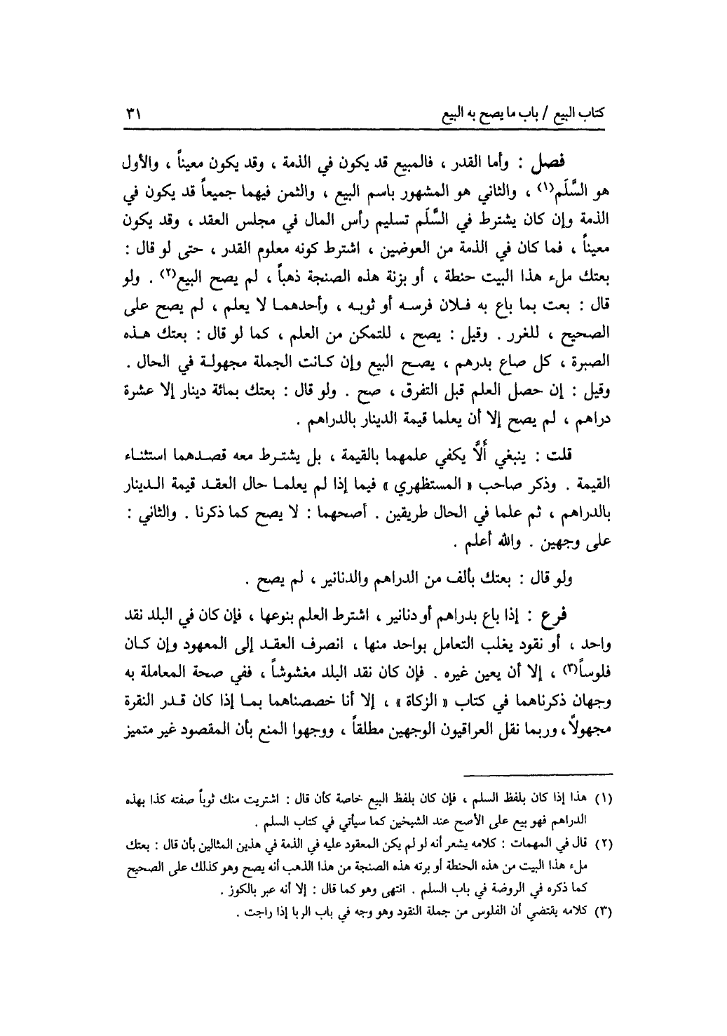 فصل وأما القدر، فالمبيع قد يكون في الذمة، وقد يكون معينا، والاول هو السلم، والثاني هو المشهور باسم البيع، والثمن فيهما جميعا قد يكون في الذمة وإن كان يشترط في السلم تسليم رأس المال في مجلس العقد، وقد يكون معينا، فما كان في الذمة من العوضين، اشترط كونه معلوم القدر، حتى لو قال: بعتك مل ء هذا البيت حنطة، أو بزنة هذه الصنجة ذهبا، لم يصح البيع. ولو قال: بعت بما باع به فلافرسه أو ثوبه، وأحدهما لا يعلم، لم يصح على الصحيح، للغرر. وقيل: يصح، للتمكن من العلم، كما لو قال: بعتك هذه الصبرة، كل صاع بدرهم، يصح البيع وإن كانت الجملة مجهولة في الحال. وقيل: إن حصل العلم قبل التفرق، صح. ولو قال: بعتك بمائة دينار إلا عشرة دراهم، لم يصح إلا أن يعلما قيمة الدينار بالدراهم. قلت: ينبغي ألا يكفي علمهما بالقيمة، بل يشترط معه قصدهما استثناء القيمة. وذكر صاحب المستظهري فيما إذا لم يعلما حال العقد قيمة الدينار بالدراهم، ثم علما في الحال طريقين. أصحهما: لا يصح كما ذكرنا. والثاني: على وجهين. والله أعلم. ولو قال: بعتك بألف من الدراهم والدنانير، لم يصح. فرع إذا باع بدرامم أو دنانير، اشترط العلم بنوعها، فإن كان في البلد نقد واحد، أو نقود يغلب التعامل بواحد منها، انصرف العقد إلى المعهود وإن كان فلوسا، إلا أن يعين غيره. فإن كان نقد البلد مغشوشا، ففي صحة المعاملة به وجهان ذكرناهما في كتاب الزكاة، إلا أنا خصصناهما بما إذا كان قدر النقرة مجولا، وربما نقل العراقيون الوجهين مطلقا، ووجهوا المنع بأن المقصود غير متميز
