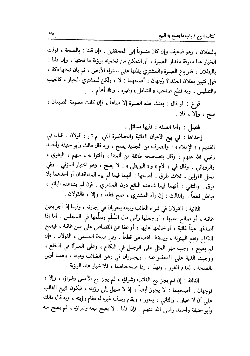 بالبطلان، وهو ضعيف وإن كان منسوبا إلى المحققين. فإن قلنا: بالصحة فوقت الخيار هنا معرفة مقدار الصبرة، أو التمكن من تخمينه برؤية ما تحتها، وإن قلنا: بالبطلان، فلو باع الصبرة والمشتري يظنها على استواء الارض، ثم بان تحتها دكة، فهل نتبين بطلان العقد ؟ وجهان: أصحهما: لا، ولكن للمشتري الخيار، كالعيب والتدليس، وبه قطع صاحب الشامل وغيره. والله أعلم. فرع لو قال: بعتك هذه الصبرة إلا صاعا، فإن كانت معلومة الصيعان، صح، وإلا، فلا. فصل وأما الصفة: ففيها مسائل. إحداها: في بيع الاعيان الغائبة والحاضرة التي لم تر، قولان. قال في القديم والاملاء: والصرف من الجديد يصح، وبه قال مالك وأبو حنيفة وأحمد رضي الله عنهم، وقال بتصحيحه طائفة من أئمتنا، وأفتوا به، منهم، البغوي، والروياني. وقال في الام والبويطي: لا يصح، وهو اختيار المزني. وفي محل القولين، ثلاث طرق. أصحها: أنهما فيما لم يره المتعاقدان أو أحدهما جلا فرق. والثاني: أنهما فيما شاهده البائع دون المشتري. فإن لم يشاهده البائع، فباطل قطعا. والثالث: إن رآه المشتري، صح قطعا، وإلا، فالقولان. الثانية: القولان في شراء الغائب وبيعه يجريان في إجارته، وفيما إذا أجر بعين غائبة، أو صالح عليها، أو جعلها رأس مال السلم وسلمها في المجلس. أما إذا أصدقها عينا غائبة، أو خالعها عليها، أو عفا عن القصاص على عين غائبة، فيصح النكاح وتقع البينونة، ويسقط القصاص قطعا. وفي صحة المسمى، القولان. فإن لم يصح، وجب مهر المثل على الرجل في النكاح، وعلى المرأة في الخلع، ووجبت الدية على المعفو عنه. ويجريان في رهن الغائب وهبته، وهما أولى بالصحح، لعدم الغرر. ولهذا، إذا صححناهما، فلا خيار عند الرؤية. الثالثة: إن لم يجز بيع الغائب وشراؤه، لم يجز بيع الاعمى وشراؤه، وإلا، فوجهان. أصحهما: لا يجوز أيضا، إذ لاسبيل إلى رؤيته، فيكون كبيع الغائب على أن لا خيار. والثاني: يجوز، ويقام وصف غيره له مقام رؤيته، وبه قال مالك وأبو حنيفة وأحمد رضي الله عنهم. فإذا قلنا: لا يصح بيعه وشراؤه، لم يصح منه