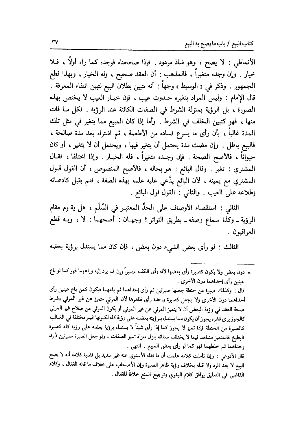 الانماطي: لا يصح، وهو شاذ مردود. فإذا صححناه، فوجده كما رآه أولا، فلا خيار. وإن وجده متغيرا، فالمذهب: أن العقد صحيح، وله الخيار، وبهذا قطع الجمهور. وذكر في الوسيط وجها: أنه يتبين بطلان البيع لتبين انتفاء المعروفة. قال الامام: وليس المراد بتغيره حدوث عيب، فإن خيار الغيب لا يختص بهذه الصورة، بل الرؤية بمنزلة الشرط في الصفات الكائنة عند الرؤية. فكل ما فات منها، فهو كتبين الخلف في الشرط. وأما إذا كان المبيع مما يتغير في مثل تلك المدة غالبا، بأن رأى ما يسرع فساده من الاطعمة، ثم اشتراه بعد مدة صالحة، فالبيع باطل. وإن مضت مدة يحتمل أن يتغير فيها، ويحتمل أن لا يتغير، أو كان حيوانا، فالاصح الصحة. فإن وجده متغيرا، فله الخيار. وإذا اختلفا، فقال المشتري: تغير. وقال البائع: هو بحاله، فالاصح المنصوص، أن القول قول المشتري مع يمينه، لان البائع يدعي عليه علمه بهذه الصفة، فلم يقبل كادعائه اطلاعه على العيب. والثاني: القول قول البائع. الثاني: استقصاء الاوصاف على الحد المعتبر في السلم، هل يقوم مقام الرؤية - وكذا سماع وصفه - بطرق التواتر ؟ وجهان. أصحهما: لا، وبه قطع العراقيون. الثالث: لو رأى بعض الشئ دون بعض، فإن كان مما يستدل برؤية بعضه
