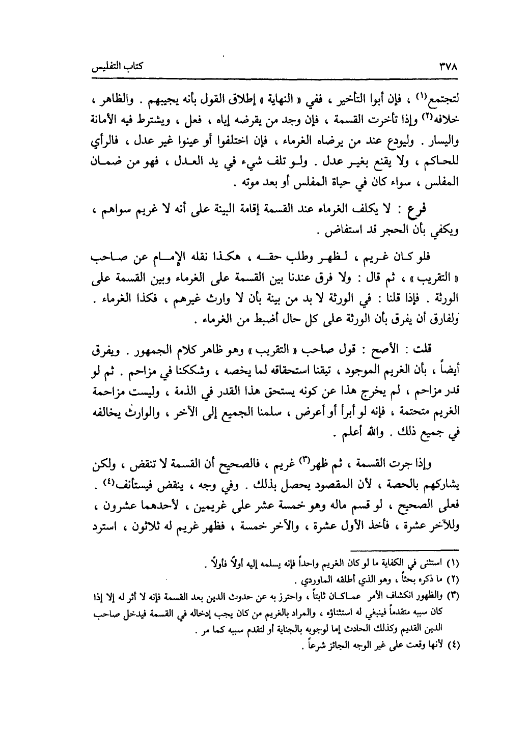 لتجتمع، فإن أبوا التأخير، ففي النهاية إطلاق القول بأنه يجيبهم. والظاهر، خلافه وإذا تأخرت القسمة، فإن وجد من يقرضه إياه، فعل، ويشترط فيه الامانة واليسار. وليودع عند من يرضاه الغرماء، فإن اختلفوا أو عينوا غير عدل، فالرأي للحاكم، ولا يقنع بغير عدل. ولو تلف شئ في يد العدل، فهو من ضمان المفلس، سواء كان في حياة المفلس أو بعد موته. فرع لا يكلف الغرماء عند القسمة إقامة البينة على أنه لا غريم سواهم، ويكفي بأن الحجر قد إستفاض. فلو كان غريم، لظهر وطلب حقه، هكذا نقله الامام عن صاحب التقريب، ثم قال: ولا فرق عندنا بين القسمة على الغرماء وبين القسمة على الورثة. فإذا قلنا: في الورثة لا بد من بينة بأن لا وارث غيرهم، فكذا الغرماء. ولفارق أن يفرق بأن الورثة على كل حال أضبط من الغرماء. قلت: الاصح: قول صاحب التقريب وهو ظاهر كلام الجمهور. ويفرق أيضا، بأن الغريم الموجود، تيقنا إستحقاقه لما يخصه، وشككنا في مزاحم. ثم لو قدر مزاحم، لم يخرج هذا عن كونه يستحق هذا القدر في الذمة، وليست مزاحمة الغريم متحتمة، فإنه لو أبرأ أو أعرض، سلمنا الجميع إلى الآخر، والوارث يخالفه في جميع ذلك. والله أعلم. وإذا جرت القسمة، ثم ظهر غريم، فالصحيح أن القسمة لا تنقض، ولكن يشاركهم بالحصة، لان المقصود يحصل بذلك. وفي وجه، ينقض فيستأنف. فعلى الصحيح، لو قسم ماله وهو خمسة عشر على غريمين، لاحدهما عشرون، وللآخر عشرة، فأخذ الاول عشرة، والآخر خمسة، فظهر غريم له ثلاثين، إسترد