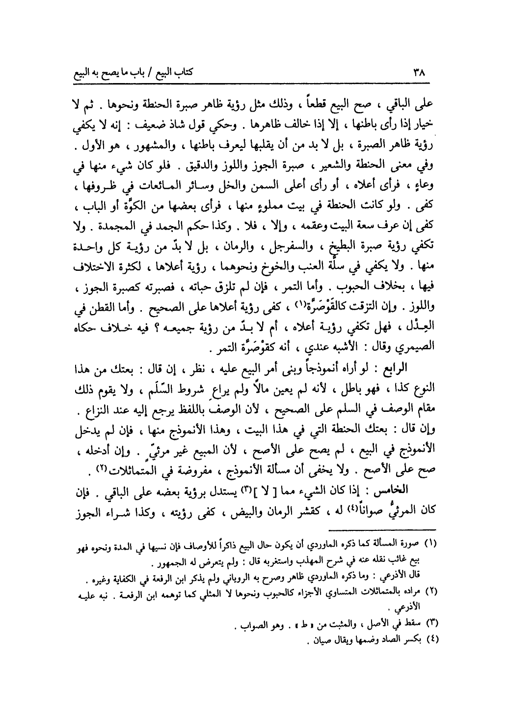 على الباقي، صح البيع قطعا، وذلك مثل رؤية ظاهر صبرة الحنطة ونحوها. ثم لا خيار إذا رأى باطنها، إلا إذا خالف ظاهرها. وحكي قول شاذ ضعيف: أنه لا يكفى رؤية ظاهر الصبرة، بل لا بد من أن يقلبها ليعرف باطنها، والمشهور، هو الاول. وفي معنى الحنطة والشعير، صبرة الجوز واللوز والدقيق. فلو كان شئ منها في وعاء، فرأى أعلاه، أو رأى أعلى السمن والخل وسائر المائعات في ظروفها، كفى. ولو كانت الحنطة في بيت مملوء منها، فرأى بعضها من الكوة أو الباب، كفى إن عرف سعة البيت وعمقه، وإلا، فلا. وكذا حكم الجمد في المجمدة. ولا تكفي رؤية صبرة البطيخ، والسفرجل، والرمان، بل لا بد من رؤية كل واحدة منها. ولا يكفي في سلة العنب والخوخ ونحوهما، رؤية أعلاها، لكثرة الاختلاف فيها، بخلاف الحبوب. وأما التمر، فإن لم تلزق حباته، فصبرته كصبرة الجوز، واللوز. وإن التزقت كالقوصرة، كفى رؤية أعلاها على الصحيح. وأما القطن في العدل، فهل تكفي رؤية أعلاه، أم لا بد من رؤية جميعه ؟ فيه خلاف حكاه الصيمري وقال: الاشبه عندي، أنه كقوصرة التمر. الرابع: لو أراه أنموذجا وبنى أمر البيع عليه، نظر، إن قال: بعتك من هذا النوع كذا، فهو باطل، لانه لم يعين مالا ولم يراع شروط السلم، ولا يقوم ذلك مقام الوصف في السلم على الصحيح، لانالوصف باللفظ يرجع إليه عند النزاع. وإن قال: بعتك الحنطة التي في هذا البيت، وهذا الانموذج منها، فإن لم يدخل الانموذج في البيع، لم يصح على الاصح، لان المبيع غير. مرئي. وإن أدخله، صح على الاصح. ولا يخفى أن مسألة الانموذج، مفروضة في المتماثلات. الخامس: إذا كان الشئ مما لا يستدل برؤية بعضه على الباقي. فإن كان المرئي صوانا له، كقشر الرمان والبيض، كفى رؤيته، وكذا شراء الجوز