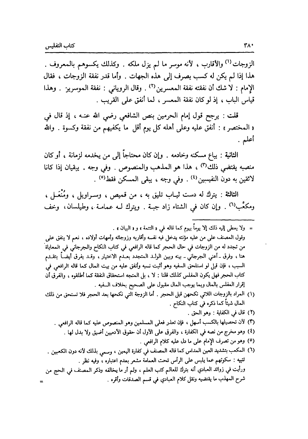 الزوجات والاقارب، لانه موسر ما لم يزل ملكه. وكذلك يكسوهم بالمعروف. هذا إذا لم يكن له كسب يصرف إلى هذه الجهات. وأما قدر نفقة الزوجات، فقال الامام: لا شك أن نفقته نفقة المعسرين. وقال الروياني: نفقة الموسرين. وهذا قياس الباب، إذ لو كان نفقة المعسر، لما أنفق على القريب. قلت: يرجح قول إمام الحرمين بنص الشافعي رضي الله عنه، إذ قال في المختصر: أنفق عليه وعلى أهله كل يوم أقل ما يكفيهم من نفقة وكسوة. والله أعلم. الثانية: يباع مسكنه وخادمه. وإن كان محتاجا إلى من يخدمه لزمانة، أو كان منصبه يقتضي ذلك، هذا هو المذهب والمنصوص. وفي وجه، يبقيان إذا كانا لائقين به بدون النفيسين. وفي وجه، يبقى المسكن فقط. الثالثة: يترك له دست ثياب تليق به، من قميص، وسراويل، ومنعل، ومكعب. وإن كان في الشتاء زاد جبة. ويترك له عمامة، وطيلسان، وخف