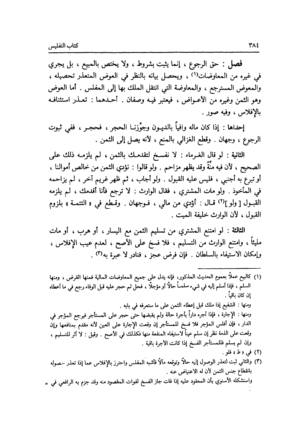 فصل حق الرجوع، إنما يثبت بشروط، ولا يختص بالمبيع، بل يجري في غيره من المعاوضات، ويحصل بيانه بالنظر في العوض المتعذر تحصيله، والمعوض المسترجع، والمعاوضة التي انتقل الملك بها إلى المفلس. أما العوض وهو الثمن وغيره من الاعواض، فيعتبر فيه وصفان. أحدهما: تعذر استئنافه بالافلاس، وفيه صور. إحداها: إذا كان ماله وافيا بالديون وجوزنا الحجر، فحجر، ففي ثبوت الرجوع، وجهان. وقطع الغزالي بالمنع، لانه يصل إلى الثمن. الثانية: لو قال الغرماء: لا نفسخ لتقدمك بالثمن، لم يلزمه ذلك على الصحيح، لان فيه منة وقد يظهر مزاحم. ولو قالوا: نؤدي الثمن من خالص أموالنا، أو تبرع به أجنبي، فليس عليه القبول. ولو أجاب، ثم ظهر غريم آخر، لم يزاحمه في المأخوذ. ولو مات المشتري، فقال الوارث: لا ترجع فأنا أقدمك، لم يلزمه القبول. فلو قال: أؤدي من مالي، فوجهان. وقطع في التتمة بلزوم القبول، لان الوارث خليفة الميت. الثالثة: لو امتنع المشتري من تسليم الثمن مع اليسار، أو هرب، أو مات مليئا، وامتنع الوارث من التسليم، فلا فسخ على الاصح، لعدم عيب الافلاس، وإمكان الاستيفاء بالسلطان. فإن فرض عجز، فنادر لا عبرة به.