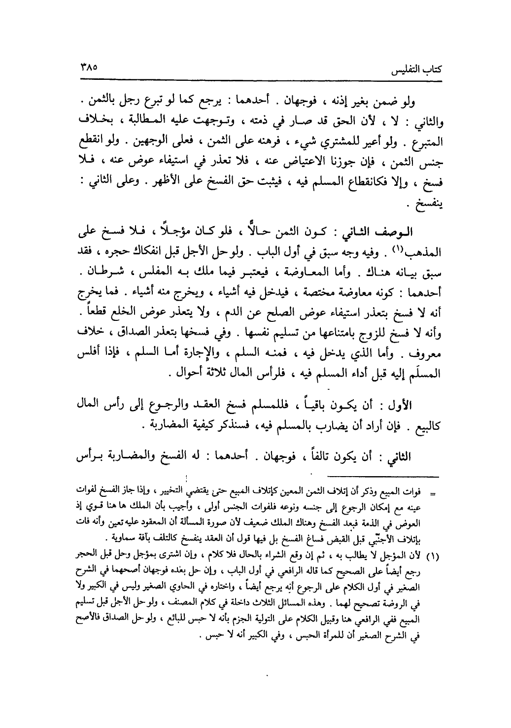 ولو ضمن بغير إذنه، فوجهان. أحدهما: يرجع كما لو تبرع رجل بالثمن. والثاني: لا، لان الحق قد صار في ذمته، وتوجهت عليه المطالبة، بخلاف المتبرع. ولو أعير للمشتري شئ، فرهنه على الثمن، فعلى الوجهين. ولو انقطع الجنس الثمن، فإن جوزنا الاعتياض عنه، فلا تعذر في استيفاء عوض عنه، فلا فسخ، وإلا فكانقطاع المسلم فيه، فيثبت حق الفسخ على الاظهر. وعلى الثاني: ينفسخ. الوصف الثاني: كون الثمن حالا. فلو كان مؤجلا، فلا فسخ على المذهب. وفيه وجه سبق في أول الباب. ولو حل الاجل قبل انفكاك حجره، فقد سبق بيانه هناك وأما المعاوضة، فيعتبر فيما ملك به المفلس، شرطان. أحدهما: كونه معاوضة مختصة، فيدخل فيه أشياء، ويخرج منه أشياء. فما يخرج أنه لا فسخ بتعذر استيفاء عوض الصلح عن الدم، ولا يتعذر عوض الخلع قطعا. وأنه لا فسخ للزوج بامتناعها من تسليم نفسها. وفي فسخها بتعذر الصداق، خلاف معروف. وأما الذي يدخل فيه، فمنه السلم، والاجارة. أما السلم، فإذا أفلس المسلم إليه قبل أداء المسلم فيه، فلرأس المال ثلاثة أحوال. الاول: أن يكون باقيا، فللمسلم فسخ العقد والرجوع إلى رأس المال كالبيع. فإن أراد أن يضارب بالمسلم فيه، فسنذكر كيفية المضاربة. الثاني: أن يكون تالفا، فوجهان. أحدهما: له الفسخ والمضاربة برأس