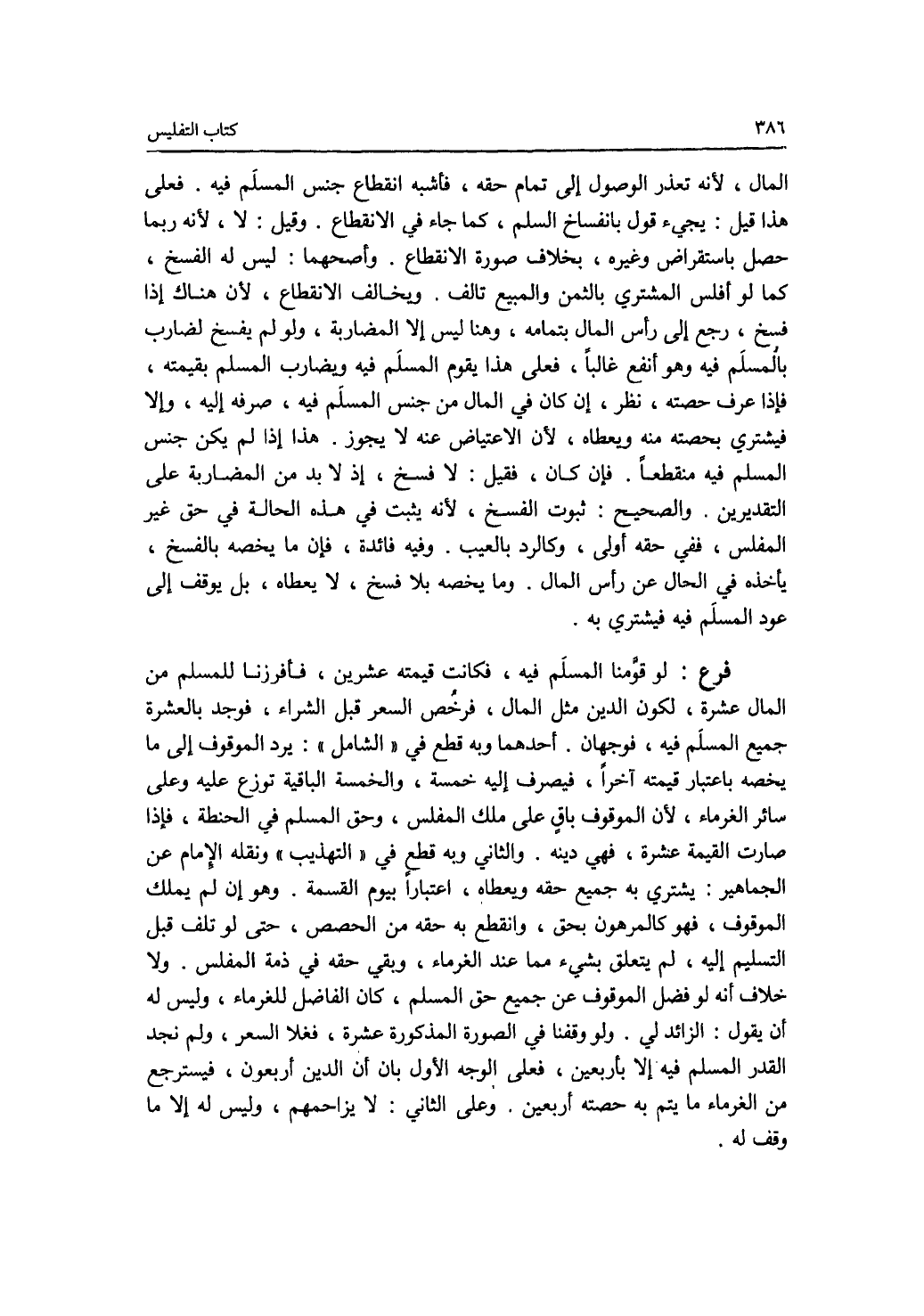 المال، لانه تعذر الوصول إلى تمام حقه، فأشبه انقطاع جنس المسلم فيه. فعلى هذا قيل: يجئ قول بانفساخ السلم، كما جاء في الانقطاع. وقيل: لا، لانه ربما حصل باستقراض وغيره، بخلاف صورة الانقطاع. وأصحهما: ليس له الفسخ، كما لو أفلس المشتري بالثمن والمبيع تالف. ويخالف الانقطاع، لان هناك إذا فسخ، رجع إلى رأس المال بتمامه، وهنا ليس إلا المضاربة، ولو لم يفسخ لضارب بالمسلم فيه وهو أنفع غالبا، فعلى هذا يقوم المسلم فيه ويضارب المسلم بقيمته، فإذا عرف حصته، نظر، إن كان في المال من جنس المسلم فيه، صرفه إليه، وإلا فيشتري بحصته منه ويعطاه، لان الاعتياض عنه لا يجوز. هذا إذا لم يكن جنس المسلم فيه منقطعا. فإن كان، فقيل: لا فسخ، إذ لا بد من المضاربة على التقديرين. والصحيح: ثبوت الفسخ، لانه يثبت في هذه الحالة في حق غير المفلس، ففي حقه أولى، وكالرد بالعيب. وفيه فائدة، فإن ما يخصه بالفسخ، يأخذه في الحال عن رأس المال. وما يخصه بلا فسخ، لا يعطاه، بل يوقف إلى عود المسلم فيه فيشتري به. فرع لو قومنا المسلم فيه، فكانت قيمته عشرين، فأفرزنا للمسلم فيه من المال عشرة، لكون الدين مثل المال، فرخص السعر قبل الشراء، فوجد بالعشرة جميع المسلم فيه، فوجهان. أحدهما وبه قطع في الشامل: يرد الموقوف إلى ما يخصه باعتبار قيمته آخرا، فيصرف إليه خمسة، والخمسة الباقية توزع عليه وعلى سائر الغرماء، لان الموقوف باق على ملك المفلس، وحق المسلم في الحنطة، فإذا صارت القيمة عشرة، فهي دينه. والثاني وبه قطع في التهذيب ونقله الامام عن الجماهير: يشتري به جميع حقه ويعطاه، إعتبارا بيوم القسمة. وهو إن لم يملك الموقوف، فهو كالمرهون بحق، وانقطع به حقه من الحصص، حتى لو تلف قبل التسليم إليه، لم يتعلق بشئ مما عند الغرماء وبقي حقه في ذمة المفلس. ولا خلاف أنه لو فضل الموقوف عن جميع حق المسلم، كان الفاضل للغرماء، وليس له أن يقول: الزائد لي. ولو وقفنا في الصورة المذكور عشرة، فغلا السعر، ولم نجد القدر المسلم فيه إلا بأربعين، فعلى الوجه الاول بان أن الدين أربعون، فيسترجع من الغرماء ما يتم به حصته أربعين. وعلى الثاني: لا يزاحمهم، وليس له إلا ما وقف له.