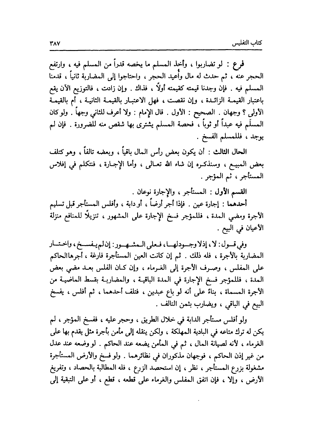 فرع لو تضاربوا، وأخذ المسلم ما يخصه قدرا من المسلم فيه، وارتفع الحجر عنه، ثم حدث له مال وأعيد الحجر، واحتاجوا إلى المضاربة ثانيا، قدمنا المسلم فيه. فإن وجدنا قيمته كقيمته أولا، فذاك. وإن زادت، فالتوزيع الآن يقع باعتبار القيمة الزائدة، وإن نقصت، فهل الاعتبار بالقيمة الثانية، أم بالقيمة الاولى ؟ وجهان. الصحيح: الاول. قال الامام: ولا أعرف للثاني وجها. ولو كان المسلم فيه عبدا أو ثوبا، فحصه المسلم يشترى بها شقص منه للضرورة. فإن لم يوجد، فللمسلم الفسخ. الحال الثالث: أن يكون بع ض رأس المال باقيا، وبعضه تالفا، وهو كتلف بعض المبيع، وسنذكره إن شاء الله تعالى، وأما الاجارة، فنتكلم في إفلاس المستأجر، ثم المؤجر. القسم الاول: المستأجر، والاجارة نوعان. أحدهما: إجارة عين. فإذا أجر أرضا، أو دابة، وأفلس المستأجر قبل تسليم الاجرة ومضي المدة، فللمؤجر فيه فسخ الاجارة على المشهور، تنزيلا للمنافع منزلة الاعيان في البيع. وفي قول: لا، إذ لا ؟ وجود لها. فعلى المشهور: إن لم يفسخ، واختار المضاربة بالاجرة، فله ذلك. ثم إن كانت العين المستأجرة فارغة، أجرها الحاكم على المفلس، وصرف الاجرة إلى الغرماء. وإن كان الفلس بعد مضي بعض المدة، فللمؤجر فسخ الاجارة في المدة الباقية، والمضاربة بقسط الماضية من الاجرة المسماة، بناء على أنه لو باع عبدين، فتلف أحدهما، ثم أفلس، يفسخ البيع في الباقي، ويضارب بثمن التالف. ولو أفلس مستأجر الدابة في خلال الطريق، وحجر عليه، ففسخ المؤجر، لم يكن له ترك متاعه في البادية المهلكة، ولكن ينقله إلى مأمن بأجرة مثل يقدم بها على الغرماء، لانه لصيانة المال، ثم في المأمن يضعه عند الحاكم. ولو وضعه عند عدل من غير إذن الحاكم، فوجهان مذكوران في نظائرهما. ولو فسخ والارض المستأجرة مشغولة بزرع المستأجر، نظر، إن استحصد الزرع، فله المطالبة بالحصاد، وتفريغ الارض، وإلا، فإن اتفق المفلس والغرماء على قطعه، قطع، أو على التبقية إلى