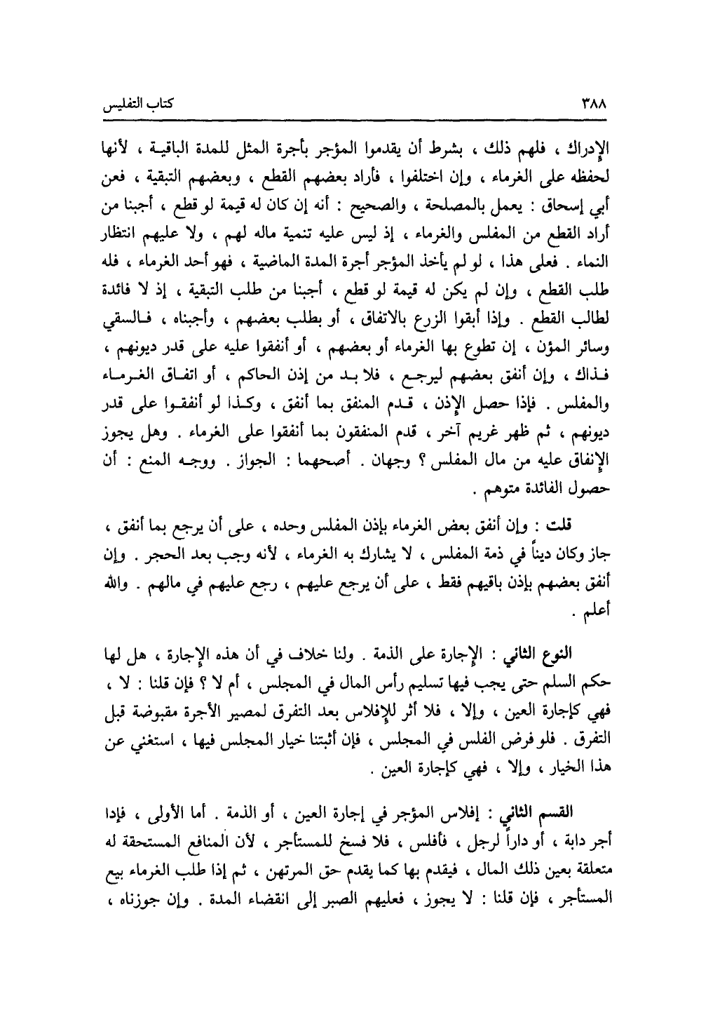 الادراك، فلهم ذلك، بشرط أن يقدموا المؤجر بأجرة المثل للمدة الباقية، لانها لحفظه على الغرماء. وإن اختلفوا، فأراد بعضهم القطع، وبعضهم التبقية، فعن أبي إسحق: يعمل بالمصلحة، والصحيح: أنه إن كان له قيمة قطع، أجبنا من أراد القطع من المفلس والغرماء، إذ ليس عليه تنمية ماله لهم، ولا عليهم إنتظار النماء. فعلى هذا، لو لم يأخذ المؤجر أجرة المدة الماضية، فهو أحد الغرماء، فله طلب القطع، وإن لم يكن له قيمة لو قطع، أجبنا من طلب التبقية، إذ لا فائدة لطالب القطع. وإذا أبقوا الزرع بالاتفاق، أو بطلب بعضهم، وأجبناه، فالسقي وسائر المؤن، إن تطوع بها الغرماء أو بعضهم، أو أنفقوا عليه على قدر ديونهم، فذاك، وإن أنفق بعضهم ليرجع، فلا بد من إذن الحاكم، أو اتفاق الغرماء والمفلس. فإذا حصل الاذن، قدم المنفق بما أنفق. وكذا لو أنفقوا على قدر ديونهم، ثم ظهر غريم آخر، قدم المنفقون بما أنفقوا على الغرماء. وهل يجوز الانفاق عليه من مال المفلس ؟ وجهان. أصحهما: الجواز. ووجه المنع: أن حصول الفائدة متوهم. قلت: وإن أنفق بإذن المفلس وحده، على أن يرجع بما أنفق، جاز وكان دينا في ذمة المفلس، لا يشارك به الغرماء، لانه وجب بعد الحجر. وإن أنفق بعضهم بإذن باقيهم فقط، على أن يرجع عليهم، رجع عليهم في مالهم. والله أعلم. النوع الثاني: الاجارة على الذمة. ولنا خلاف في أن هذه الاجارة، هل لها حكم السلم حتى يجب فيها تسليم رأس المال في المجلس، أم لا ؟ فإن قلنا: لا، فهي كإجارة العين، وإلا، فلا أثر للافلاس بعد التفرق لمصير الاجرة مقبوضة قبل التفرق. فلو فرض الفلس في المجلس، فإن أثبتنا خيار المجلس فيها، إستغني عن هذا الخيار، وإلا، فهي كإجارة العين. القسم الثاني: إفلاس المؤجر في إجارة العين، أو الذمة. أما الاولى، فإذا أجر دابة، أو دارا لرجل، فأفلس، فلا فسخ للمستأجر، لان المنافع المستحقة له متعلقة بعين ذلك المال، فيقدم بها كما يقدم حق المرتهن، ثم إذا طلب الغرماء بيع المستأجر، فإن قلنا: لا يجوز، فعليهم الصبر إلى انقضاء المدة. وإن جوزناه،