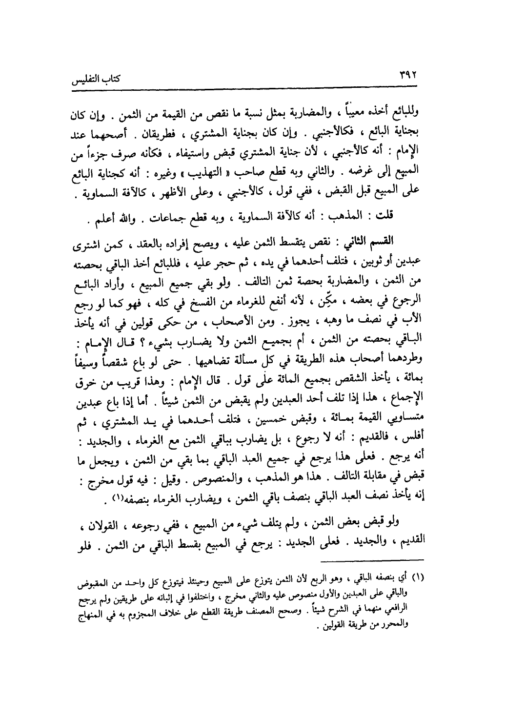 وللبائع أخذه معيبا، والمضاربة بمثل نسبة ما نقص من القيمة من الثمن. وإن كان بجناية البائع، فكالأجنبي 2 (212). وإن كان بجناية المشتري، فطريقان. أصحهما عند الامام: أنه كالاجنبي، لان جناية المشتري قبض واستيفاء، فكأنه صر ف جزءا من المبيع إلى غرضه. والثاني وبه قطع صاحب التهذيب وغيره: أنه كجناية البائع على المبيع قبل القبض، ففي قول، كالاجنبي، وعلى الاظهر، كالآفة السماوية. قلت: المذهب: أنه كالآفة السماوية، وبه قطع جماعات. والل أعلم. القسم الثاني: نقص يتقسط الثمن عليه، ويصح إفراده بالعقد، كمن اشترى عبدين أو ثوبين، فتلف أحدهما في يده، ثم حجر عليه، فللبائع أخذ الباقي بحصته من الثمن، والمضاربة بحصة ثمن التالف. ولو بقي جميع المبيع، وأراد البائع الرجوع في بعضه، مكن، لانه أنفع للغرماء من الفسخ في كله، فهو كما لو رجع الاب في نصف ما وهبه، يجوز. ومن الاصحاب، من حكى قولين في أنه يأخذ الباقي بحصته من الثمن، أم بجميع الثمن ولا يضارب بشئ ؟ قال الامام: وطردهما أصحاب هذه الطريقة في كل مسألة تضاهيها. حتى لو باع شقصا وسيفا بمائة، يأخذ الشقص بجميع المائة على قول. قال الامام: وهذا قريب من خرق الاجماع هذا إذا تلف أحد العبدين ولم يقبض من الثمن شيئا. أما إذا باع عبدين متساويي القيمة بمائة، وقبض خمسين، فتلف أحدهما في يد المشتري، ثم أفلس، فالقديم: أنه لا رجوع، بل يضارب بباقي الثمن مع الغرماء، والجديد: أنه يرجع. فعلى هذا يرجع في جميع العبد الباقي بما يفي من الثمن، ويجعل ما قبض في مقابلة التالف. هذا هو المذهب، والمنصوص. وقيل: فيه قول مخرج: أنه يأخذ نصف العبد الباقي بنصف باقي الثمن، ويضارب الغرماء بنصفه. ولو قبض بعض الثمن، ولم يتلف شئ من المبيع، ففي رجوعه، القولان، القديم، والجديد. فعلى الجديد: يرجع في المبيع بقسط الباقي من الثمن. فلو