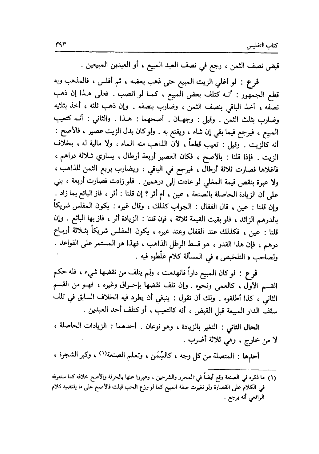 قبض نصف الثمن، رجع في نصف العبد المبيع، أو العبدين المبيعين. فرع لو أغلى الزيت المبيع حتى ذهب بعضه، ثم أفلس، فالمذهب وبه قطع الجمهور: أنه كتلف بعض المبيع، كما لو انصب. فعلى هذا إن ذهب نصفه، أخذ الباقي بنصف الثمن، وضارب بنصفه. وإن ذهب ثلثه، أخذ بثلثيه وضارب بثلث الثمن. وقيل: وجهان. أصحهما: هذا. والثاني: أنه كتعيب المبيع، فيرجع فيما بقي إن شاء، ويقنع به. ولو كان بدل الزيت عصير، فالاصح: أنه كالزيت. وقيل: تعيب قطعا، لان الذاهب منه الماء، ولا مالية له، بخلاف الزيت. فإذا قلنا: بالاصح، فكان العصير أربعة أرطال، يساوي ثلاثة دراهم، فأغلاها فصارت ثلاثة أرطال، فيرجع في الباقي، ويضارب بربع الثمن للذاهب، ولا عبرة بنقص قيمة المغلي لو عادت إلى درهمين. فلو زادت فصارت أربعة، بني على أن الزيادة الحاصلة بالصنعة، عين، أم أثر ؟ إن قلنا: أثر، فاز البائع بما زاد. وإن قلنا: عين، قال القفال: الجواب كذلك. وقال غيره: يكون المفلس شريكا بالدرهم الزائد. فلو بقيت القيمة ثلاثة، فإن قلنا: الزيادة أثر، فاز بها البائع. وإن قلنا: عين، فكذلك عند القفال وعند غيره، يكون المفلس شريكا بثلاثة أرباع درهم، فإن هذا القدر، هو قسط الرطل الذاهب، فهذا هو المستمر على القواعد. ولصاحب التلخيص في المسألة كلام غلطوه فيه. فرع لو كان المبيع دارا فانهدمت، ولم يتلف من نقضها شئ، فله حكم القسم الاول، كالعمى ونحوه. وإن تلف نقضها بإحراق وغيره، فهو من القسم الثاني، كذا أطلقوه. ولك أن تقول: ينبغي أن يطرد فيه الخلاف السابق في تلف سقف الدار المبيعة قبل القبض، أنه كالتعيب، أو كتلف أحد العبدين. الحال الثاني: التغير بالزيادة، وهو نوعان. أحدهما: الزيادات الحاصلة، لا من خارج، وهي ثلاثة أضرب. أحدها: المتصلة من كل وجه، كالسمن، وتعلم الصنعة، وكبر الشجرة،