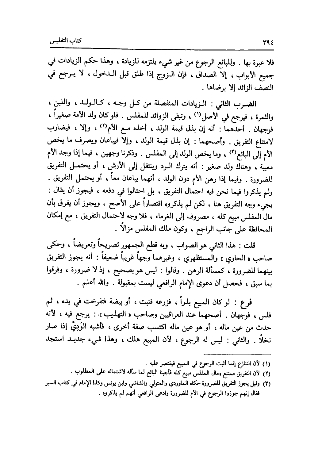 فلا عبرة بها. وللبائع الرجوع من غير شئ يلتزمه للزيادة، وهذا حكم الزيادات في جميع الابواب، إلا الصداق، فإن الزوج إذا طلق قبل الدخول، لا يرجع في النصف الزائد إلا برضاها. الضرب الثاني: الزيادات المنفصلة من كل وجه، كالولد، واللبن، والثمرة، فيرجع في الاصل، وتبقى الزوائد للمفلس. فلو كان ولد الامة صغيرا، فوجهان. أحدهما: أنه إن بذل قيمة الولد، أخذه مع الام، وإلا، فيضار ب لامتناع التفريق. وأصحهما: إن بذل قيمة الولد، وإلا فيباعان ويصرف ما يخص الا إلى البائع، وما يخص الولد إلى المفلس. وذكرنا وجهين، فيما إذا وجد الام معيبة، وهناك ولد صغير: أنه الرد وينتقل إلى الارش، أو يحتمل التفريق للضرورة. وفيما إذا رهن الام دون الولد، أنهما يباعان معا، أو يحتمل التفريق. ولم يذكروا فيما نحن فيه احتمال التفريق، بل احتالوا في دفعه، فيجوز أن يقال: يجئ وجه التفريق هنا، لكن لم يذكروه اقتصارا على الاصح، ويجوز أن يفرق بأن مال المفلس مبيع كله، مصروف إلى الغرماء، فلا وجه لاحتمال التفريق، مع إمكان المحافظة على جانب الراجع، وكون ملك المفلس مزالا. قلت: هذا الثاني هو الصواب، وبه قطع الجمهور تصريحا وتعريضا، وحكى صاحب الحاوي والمستظهري، وغيرهما وجها غريبا ضعيفا: أنه يجوز التفريق بينهما للضرورة، كمسألة الرهن. وقالوا: ليس هو بصحيح، إذ لا ضرورة، وفرقوا بما سبق، فحصل أن دعوى الامام الرافعي ليست بمقبولة. والله أعلم. فرع لو كان المبيع بذرا، فزرعه فنبت، أو بيضة فتفرخت في يده، ثم فلس، فوجهان. أصحهما عند العراقيين وصاحب التهذيب: يرجع فيه، لانه حدث من عين ماله، أو هو عين ماله اكتسب صفة أخرى، فأشبه الودي إذا صار نخلا. والثاني: ليس له الرجوع، لان المبيع هلك، وهذا شئ جديد إستجد
