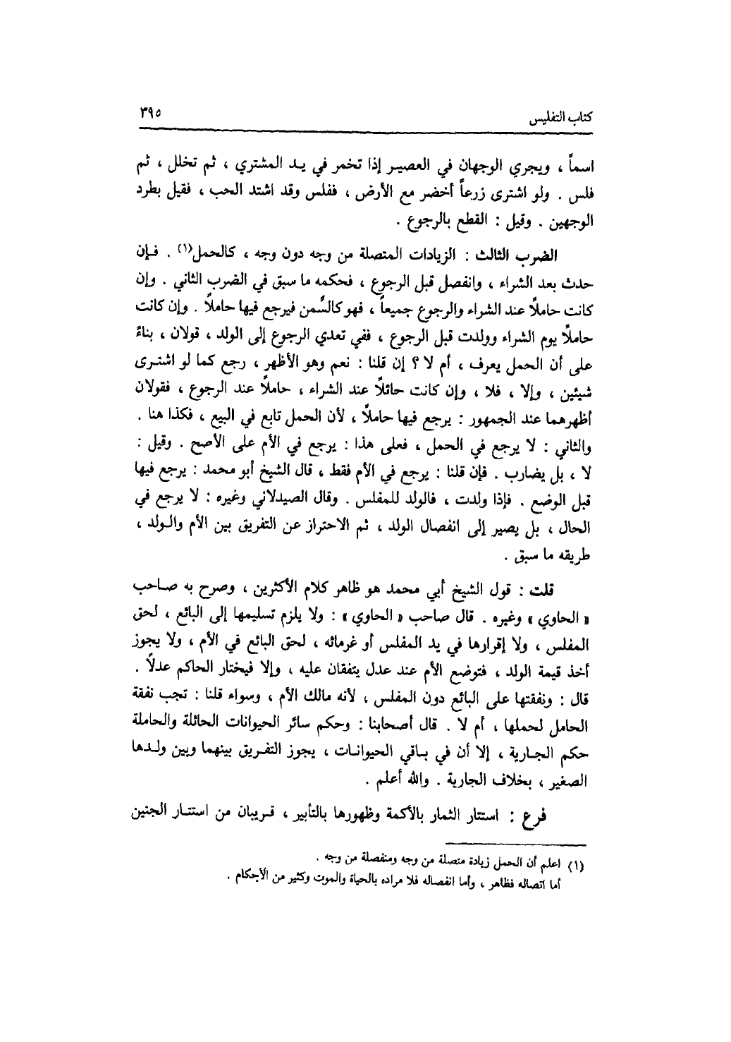 إسما، ويجري الوجهان في العصير إذا تخمر في يد المشتري، ثم تخلل، ثم فلس. ولو اشترى زرعا أخضر مع الارض، ففلس وقد اشتد الحب، فقيل بطرد الوجهين. وقيل: القطع بالرجوع. الضرب الثالث: الزيادات المتصلة من وجه دون وجه، كالحمل. فإن حدث بعد الشراء، وانفصل قبل الرجوع، فحكمه ما سبق في الضرب الثاني. وإن كانت حاملا عند الشراء والرجوع جميعا، فهو كالسمن فيرجع فيها حاملا. وإن كانت حاملا قبل الشراء وولدت قبل الرجوع، ففي تعدي الرجوع إلى الولد، قولان، بناء على أن الحمل يعرف، أم لا ؟ إن قلنا: نعم وهو الاظهر، رجع كما لو اشترى شيئين، وإلا، فلا، وإن كانت حائلا عند الشراء، حاملا عند الرجوع، فقولان أظهرهما عند الجمهور: يرجع فيها حاملا، لان الحمل تابع في البيع، فكذا هنا. والثاني: لا يرجع في الحمل، فعلى هذا: يرجع في الام على الاصح. وقيل: لا، بل يضارب. فإن قلنا: يرجع في الام فقط، قال الشيخ أبو محمد: يرجع فيها قبل الوضع. فإذا ولدت، فالولد للمفلس. وقال الصيدلاني وغيره: لا يرجع في الحال، بل يصير إلى انفصال الولد، ثم الاحتراز عن التفريق بين الام والولد، طريقه ما سبق. قلت: قول الشيخ أبي محمد هو ظاهر كلام الاكثرين، وصرح به صاحب الحاوي وغيره. قال صاحب الحاوي: ولا يلزم تسليمها إلى البائع، لحق المفلس، ولا إقرارها في يد المفلس أو غرمائه، لحق البائع في الام، ولا يجوز أخذ قيمة الولد، فتوضع الام عند عدل يتفقان عليه، وإلا فيختار الحاكم عدلا. قال: ونفقتها على البائع دون المفلس، لانه مالك الام، وسواء قلنا: تجب نفقة الحامل لحملها، أم لا. قال أصحابنا: وحكم سائر الحيوانات الحائلة والحاملة حكم الجارية، إلا أن في باقي الحيوانات، يجوز التفريق بينهما وبين ولدها الصغير، بخلاف الجارية. والله أعلم. فرع إستتار الثمار بالاكمة وظهورها بالتأبير، قريبان من إستتار الجنين