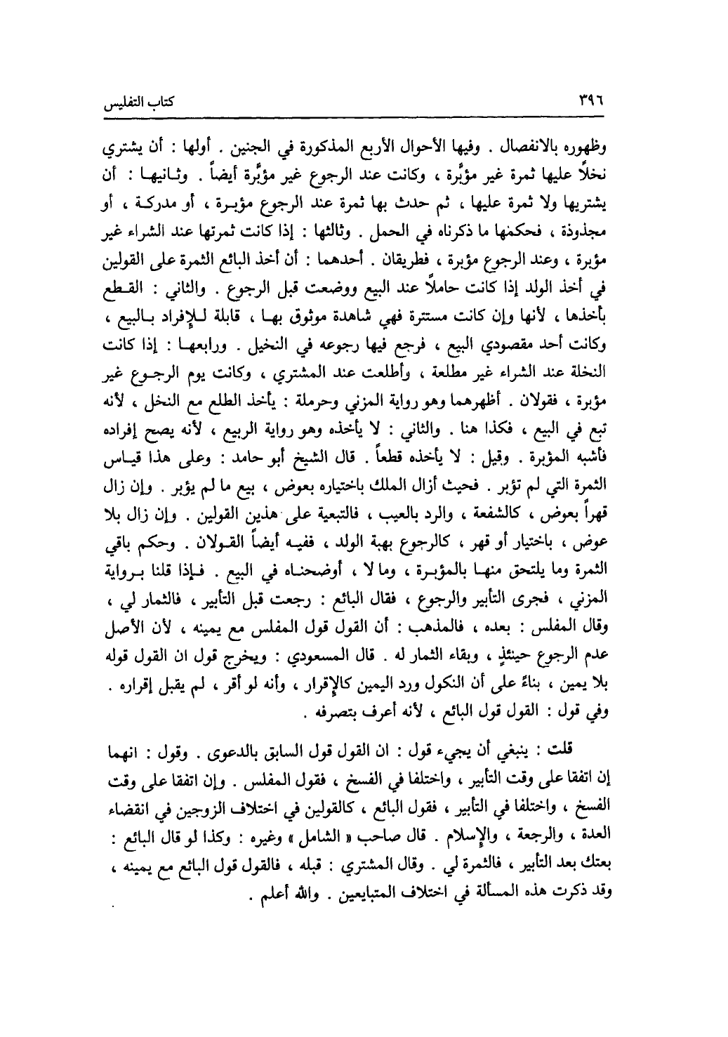 وظهوره بالانفصال. وفيها الاحوال الاربع المذكورة في الجنين. أولها: أن يشتري نخلا عليها ثمرة غير مؤبرة كانت عند الرجوع غير مؤبر أيضا. وثانيها: أن يشتريها ولا ثمرة عليها، ثم حدث بها ثمرة عند الرجوع مؤبرة، أو مدركة، أو مجذوذة، فحكمها ما ذكرناه في الحمل. وثالثها: إذا كانت ثمرتها عند الشراء غير مؤبرة، وعند الرجوع مؤبرة، فطريقان. أحدهما: أن أخذ البائع الثمرة على القولين في أخذ الولد إذا كانت حاملا عند البيع ووضعت عند الرجوع. والثاني: القطع بأخذها، لانها وإن كانت مستترة، فهي شاهدة موثوق بها، قابلة للافراد بالبيع، وكانت أحد مقصودي البيع، فرجع فيها رجوعه في النخيل. ورابعها: إذا كانت النخلة عند الشراء غير مطلعة، وأطلعت عند المشتري، وكانت يوم الرجوع غير مؤبرة، فقولان. أظهرهما وهو رواية المزني وحرملة: يأخذ الطلع مع النخل، لانه تبع في البيع، فكذا هنا. والثاني: لا يأخذه وهو رواية الربيع، لانه يصح إفراده فأشبه المؤبرة. وقيل: لا يأخذه قطعا. قال الشيخ أبو حامد: وعلى هذا قياس الثمرة التي لم تؤبر. فحيث أزال الملك باختياره بعوض، بيع ما لم يؤبر. وإن زال قهرا بعوض، كالشفعة، والرد بالعيب، فالتبعية على هذين القولين. وإن زال بلا عوض، باختيار أو قهر، كالرجوع بهبة الولد، ففيه أيضا القولان. وحكم باقي الثمرة وما يلتحق منها بالمؤبرة، ومالا، أوضحناه في البيع. فإذا قلنا برواية المزني، فجرى التأبير والرجوع، فقال البائع: رجعت قبل التأبير، فالثمار لي، وقال المفلس: بعده، فالمذهب: أن القول قول المفلس مع يمينه، لان الاصل عدم الرجوع حينئذ، وبقاء الثمار له. قال المسعودي: ويخرج قول أالقول قوله بلا يمين، بناء على أن النكول ورد اليمين كالاقرار، وأنه لو أقر، لم يقبل إقراره. وفي قول: القول قول البائع، لانه أعرف بتصرفه. قلت: ينبغي أيجئ قول: أن القول قول السابق بالدعوى. وقول: أنهما إن اتفقا على وقت التأبير، واختلفا في الفسخ، فقول المفلس. وإن اتفقا على وقت الفسخ، واختلفا في التأبير، فقول البائع، كالقولين في إختلاف الزوجين في انقضاء العدة، والرجعة، والاسلام. قال صاحب الشامل وغيره: وكذا لو قال البائع: بعتك بعد التأبير، فالثمرة لي. وقال المشتري: قبله، فالقول قول البائع مع يمينه، وقد ذكرت هذه المسألة في اختلاف المتبايعين. والله أعلم.