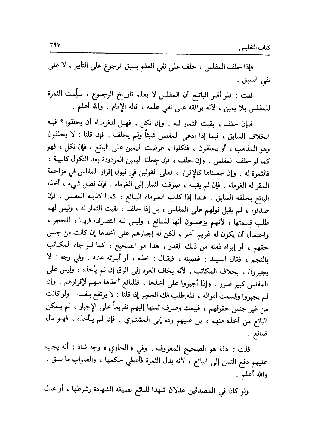 فإذا حلف المفلس، حلف على نفي العلم بسبق الرجوع على التأبير، لا على نفي السبق. قلت: فلو أقر البائع أن المفلس لا يعلم تاريخ الرجوع، سلمت الثمرة للمفلس بلا يمين، لانه يوافقه على نفي علمه، قاله الامام. والله أعلم. فإن حلف، بقيت الثمار له وإن نكل، فهل للغرماء أن يحلفوا ؟ فيه الخلاف السابق، فيما إذا ادعى المفلس شيئا ولم يحلف. فإن قلنا: لا يحلفون وهو المذهب، أو يحلفون، فنكلوا، عرضت اليمين على البائع، فإن نكل، فهو كما لو حلف المفلس. وإن حلف، فإن جعلنا اليمين المردودة بعد النكول كالبينة، فالثمرة له. وإن جعلناها كالاقرار، فعلى القولين في قبول إقرار المفلس في مزاحمة المقر له الغرماء. فإن لم يقبله، صرفت الثمار إلى الغرماء. فإن فضل شئ، أخذه البائع بحلفه السابق. هذا إذا كذب الغرماء البائع، كما كذبه المفلس. فإن صدقوه، لم يقبل قولهم على المفلس، بل إذا حلف، بقيت الثمار له، وليس لهم طلب قسمتها، لانهم يزعمون أنها للبائع، وليس له التصرف فيها، للحجر، واحتمال أن يكون له غريم آخر، لكن له إجبارهم على أخذها إن كانت من جنس حقهم، أو إبراء ذمته من ذلك القدر، هذا هو الصحيح، كما لو جاء المكاتب بالنجم، فقال السيد: غصبته، فيقال: خذه، أو أبرئه عنه. وفي وجه: لا يجبرون، بخلاف المكاتب، لانه يخاف العود إلى الرق إن لم يأخذه، وليس على المفلس كبير ضرر. وإذا أجبروا على أخذها، فللبائع أخذها منهم لاقرارهم. وإن لم يجبروا وقسمت أمواله، فله طلب فك الحجر إذا قلنا: لا يرتفع بنفسه. ولو كانت من غير جنس حقوقهم، فبيعت وصرف ثمنها إليهم تفريعا على الاجبار، لم يتمكن البائع من أخذه منهم، بل عليهم رده إلى المشتري. فإن لم يأخذه، فهو مال ضائع. قلت: هذا هو الصحيح المعروف. وفي الحاوي وجه شاذ: أنه يجب عليهم دفع الثمن إلى البائع، لانه بدل الثمرة فأعطى حكمها، والصواب ما سبق. والله أعلم. ولو كان في المصدقين عدلان شهدا للبائع بصيغة الشهادة وشرطها، أو عدل