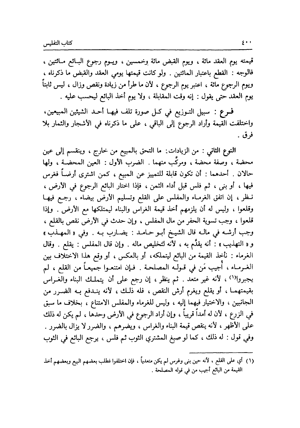 قيمته يوم العقد مائة، ويوم القبض مائة وخمسين، ويوم رجوع البائع مائتين، فالوجه: القطع باعتبار المائتين. ولو كانت قيمتها يومي العقد والقبض ما ذكرناه، ويوم الرجوع مائة، اعتبر يوم الرجوع، لان ما طرأ من زيادة ونقص وزال، ليس ثابتا يوم العقد حتى يقول: إنه وقت المقابلة، ولا يوم أخذ البائع ليحسب عليه. فرع سبيل التوزيع في كل صورة تلف فيها أحد الشيئين المبيعين، واختلفت القيمة وأراد الرجوع إلى الباقي، على ما ذكرناه في الاشجار والثمار بلا فرق. النوع الثانيمن الزيادات: ما التحق بالمبيع من خارج، وينقسم إلى عين محضة، وصفة محضة، ومركب منهما. الضرب الاول: العين المحضة، ولها حالان. أحدهما: أن تكون قابلة للتمييز عن المبيع، كمن اشترى أرضا فغرس فيها، أو بنى، ثم فلس قبل أداء الثمن، فإذا اختار البائع الرجوع في الارض، نظر، إن اتفق الغرماء والمفلس على القلع وتسليم الارض بيضاء، رجع فيها وقلعوا، وليس له أن يلزمهم أخذ قيمة الغراس والبناء ليتملكها مع الارض. وإذا قلعوا، وجب تسوية الحفر من مال المفلس، وإن حدث في الارض نقص بالقلع، وجب أرشه في ماله. قال الشيخ أبو حامد: يضارب به. وفي المهذب والتهذيب: أنه يقدم به، لانه لتخليص ماله. وإن قال المفلس: يقلع. وقال الغرماء: نأخذ القيمة من البائع ليتملكه، أو بالعكس، أو وقع هذا الاختلاف بين الغرماء، أجيب من في قوله المصلحة. فإن امتنعوا جميعا من القلع، لم يجبروا، لانه غير متعد. ثم ينظر، إن رجع على أن يتملك البناء والغراس بقيمتهما، أو يقلع ويغرم أرش النقص، فله ذلك، لانه يندفع به الضرر من الجانبين، والاختيار فيهما إليه، وليس للغرماء والمفلس الامتناع، بخلاف ما سبق في الزرع، لان له أمدا قريبا. وإن أراد الرجوع في الار ض وحدها، لم يكن له ذلك على الاظهر، لانه ينقض قيمة البناء والغراس، ويضرهم، والضرر لا يزال بالضرر. وفي قول: له ذلك، كما لو صبغ المشتري الثوب ثم فلس، يرجع البائع في الثوب