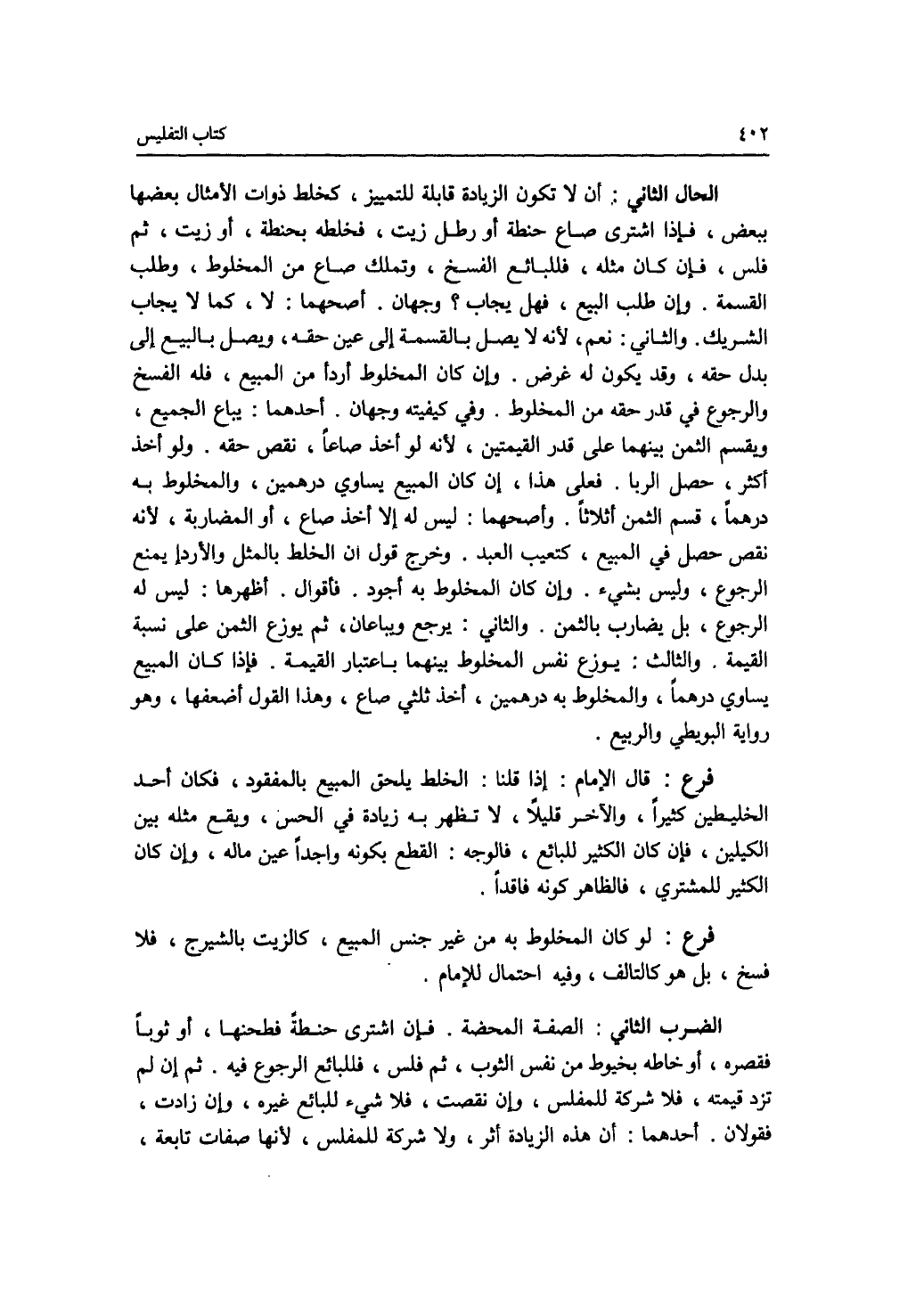 الحال الثاني: أن لا تكون الزيادة قابلة للتمييز، كخلط ذوات الامثال بعضها ببعض، فإذا اشترى صاع حنطة أو رطل زيت، فخلطه بحنطة، أو زيت، ثم فلس، فإن كان مثله، فللبائع الفسخ، وتملك صاع من المخلوط، وطلب القسمة. وإن طلب البيع، فهل يجاب ؟ وجهان. أصحهما: لا، كما لا يجاب الشريك. والثاني: نعم، لانه لا يصل بالقسمة إلى عين حقه، ويصل بالبيع إلى بدل حقه، وقد يكون له غرض. وإن كان المخلوط أردأ من المبيع، فله الفسخ والرجوع في قدر حقه من المخلوط. وفي كيفيته وجهان. أحدهما: يباع الجميع، ويقسم الثمن بينهما على قدر القيمتين، لانه لو أخذ صاعا، نقص حقه. ولو أخذ أكثر، حصل الربا. فعلى هذا، إن كان المبيع يساوي درهمين، والمخلوط به درهما، قسم الثمن أثلاثا. وأصحهما: ليس له إلا أخذ صاع، أو المضاربة، لانه نقص حصل في المبيع، كتعيب العبد. وخرج قول أن الخلط بالمثل والاردأ يمنع الرجوع، وليس بشئ. وإن كان المخلوط به أجود، فأقوال. أظهرها: ليس له الرجوع، بل يضارب بالثمن. والثاني: يرجع ويباعان، ثم يوزع الثمن على نسبة القيمة. والثالث: يوزع نفس المخلوط بينهما باعتبار القيمة. فإذا كان المبيع يساوي درهما، والمخلوط به درهمين، أخذ ثلثي صاع، وهذا القول أضعفها، وهو رواية البويطي والربيع. فرع قال الامام: إذا قلنا: الخلط يلحق المبيع بالمفقود، فكان أحد الخليطين كثيرا، والآخر قليلا، لا تظهر به زيادة في الحس، ويقع مثله بين الكيلين، فإن كان الكثير للبائع، فالوجه: القطع بكونه واجدا عين ماله، وإن كان الكثير للمشتري، فالظاهر كونه فاقدا. فرع لو كان المخلوط به من غير جنس المبيع، كالزيت بالشيرج، فلا فسخ، بل هو كالتالف، وفيه احتمال للامام. الضرب الثاني: الصفة المحضة. فإذا اشترى حنطة فطحنها، أو ثوبا فقصره، أو خاطه بخيوط من نفس الثوب، ثم فلس، فللبائع الرجوع فيه. ثم إن لم تزد قيمته، فلا شركة للمفلس، وإن نقصت، فلا شئ للبائع غيره، وإن زادت، فقولان. أحدهما: أن هذه الزيادة أثر، ولا شركة للمفلس، لانها صفات تابعة،