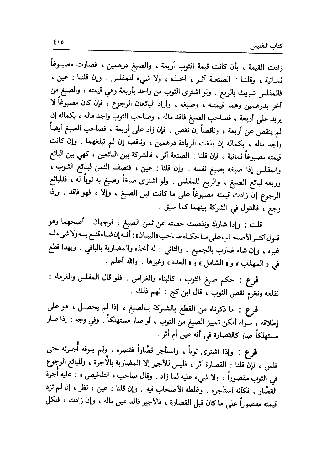 زادت القيمة، بأن كانت قيمة الثوب أربعة، والصبغ درهمين، فصارت مصبوغا ثمانية، وقلنا: الصنعة أثر، أخذه، ولا شئ للمفلس. وإن قلنا: عين، فالمفلس شريك بالربع. ولو اشترى الثوب من واحد بأربعة وهي قيمته، والصبغ من آخر بدرهمين وهما قيمته، وصبغه، وأراد البائعان الرجوع، فإن كان مصبوغا لا يزيد على أربعة، فصاحب الصبغ فاقد ماله، وصاحب الثوب واجد ماله، بكماله إن لم ينقص عن أربعة، وناقصا إن نقص. فإن زاد على أربعة، فصاحب الصبغ أيضا واجد ماله، بكماله إن بلغت الزيادة درهمين، وناقصا إن لم تبلغهما. وإن كانت قيمته مصبوغا ثمانية، فإن قلنا: الصنعة أثر، فالشركة بين البائعين، كهي بين البائع والمفلس إذا صبغه بصبغ نفسه. وإن قلنا: عين، فنصف الثمن لبائع الثوب، وربعه لبائع الصبغ، والربع للمفلس. ولو اشترى صبغا وصبغ به ثوبا له، فللبائع الرجوع إن زادت قيمته مصبوغا على ما كانت قبل الصبغ، وإلا، فهو فاقد. وإذا رجع، فالقول في الشركة بينهما كما سبق. قلت: وإذا شارك ونقصت حصته عن ثمن الصبغ، فوجهان. أصحهما وهو قول أكثر الاصحاب على ما حكاه صاحب البيان: أنه إن شاء قنع به ولا شئ له غيره، وإن شاء ضارب بالجميع. والثاني: له أخذه والمضاربة بالباقي. وبهذا قطع في المهذب والشامل والعدة وغيرها. والله أعلم. فرع حكم صبغ الثوب، كالبناء والغراس. فلو قال المفلس والغرماء: نقلعه ونغرم نقص الثوب، قال ابن كج: لهم ذلك. فرع ما ذكرناه من القطع بالشركة بالصبغ، إذا لم يحصل، هو على إطلاقه، سواء أمكن تمييز الصبغ من الثوب، أو صار مستهلكا. وفي وجه: إذا صار مستهلكا، صار كالقصارة في أنه عين أم أثر. فرع إذا اشترى ثوبا، واستأجر قصارا فقصره، ولم يوفه أجرته حتى فلس، فإن قلنا: القصارة أثر، فليس للاجير إلا المضاربة بالاجرة، وللبائع الرجوع في الثوب مقصورا، ولا شئ عليه لما زاد. وقال صاحب التلخيص: عليه أجرة القصار، فكأنه استأجره. وغلطه الاصحاب فيه. وإن قلنا: عين، نظر، إن لم تزد قيمته مقصورا على ما قبل القصارة، فالاجير فاقد عين ماله. وإن زادت، فلكل