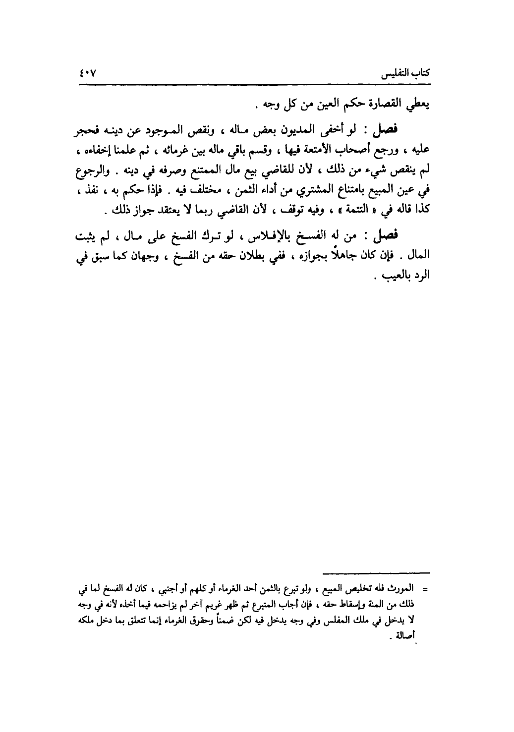 فصل لو أخفى المديون بعض ماله، ونقص الموجود عن دينه فحجر عليه، ورجع أصحاب الامتعة فيها، وقسم باقي ماله بين غرمائه، ثم علمنا إخفاءه، لم ينقص شئ من ذلك، لان للقاضي بيع مال الممتنع وصرفه في دينه. والرجوع في عين المبيع بامتناع المشتري من أداء الثمن، مختلف فيه. فإذا حكم به، نفذ، كذا قاله في التتمة، وفيه توقف، لان القاضي ربما لا يعتقد جواز ذلك.