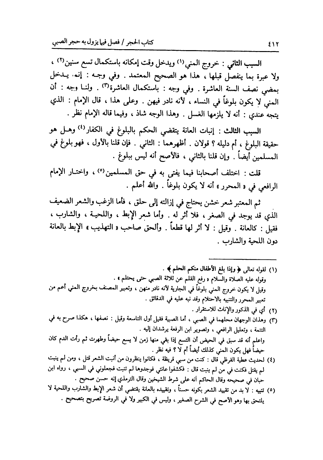 السبب الثاني: خروج المني ويدخل وقت إمكانه باستكمال تسع سنين، ولا عبرة بما ينفصل قبلها، هذا هو الصحيح المعتمد. وفي وجه: إنما يدخل بمضي نصف السنة العاشرة. وفي وجه: باستكمال العاشرة. ولنا وجه: أن المني لا يكون بلوغ في النساء، لانه نادر فيهن. وعلى هذا، قال الامام: الذي يتجه عندي: أنه لا يلزمها الغسل. وهذا الوجه شاذ، وفيما قاله الامام نظر. السبب الثالث: إنبات العانة يقتضي الحكم بالبلوغ في الكفار. وهل هو حقيقة البلوغ، أم دليله ؟ قولان. أظهرهما: الثاني. فإن قلنا بالاول، فهو بلوغ في المسلمين أيضا. وإن قلنا بالثاني، فالاصح أنه ليس ببلوغ. قلت: إختلف أصحابنا فيما يفتى به في حق المسلمين، واختار الامام الرافعي في المحرر أنه لا يكون بلوغا. والله أعلم. ثم المعتبر شعر خشن يحتاج في إزالته إلى حلق، فأما الزغب والشعر الضعيف الذي قد يوجد في الصغر، فلا أثر له. وأما شعر الابط، واللحية، والشارب، فقيل: كالعانة. وقيل: لا أثر لها قطعا. وألحق صاحب التهذيب الابط بالعانة دون اللحية والشارب.