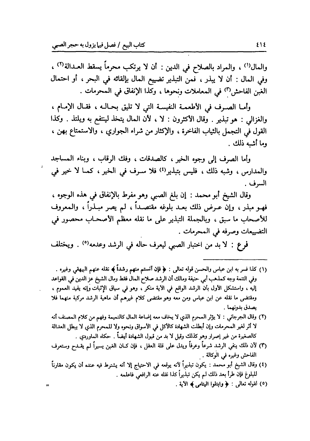 والمال، والمراد بالصلاح في الدين: أن لا يرتكب محرما يسقط العدالة، وفي المال: أن لا يبذر. فمن التبذير تضييع المال بإلقائه في البحر، أو احتمال الغبن الفاحش في المعاملات ونحوها، وكذا الانفاق في المحرمات. وأما الصرف في الاطعمة النفيسة التي لا تليق بحاله، فقال الامام، والغزالي: هو تبذير. وقال الاكثرون: لا، لان المال يتخذ لينتفع فيه ويلتذ. وكذا القول في التجمل بالثياب الفاخرة، والاكثار من شراء الجواري، والاستمتاع بهن، وما أشبه ذلك. وأما الصرف إلى وجوه الخير، كالصدقات، وفك الرقاب، وبناء المساجد و المدارس، وشبه ذلك، فليس بتبذير، فلا سرف في الخير، كما لا خير في السر وقال الشيخ أبو محمد: إن بلغ الصبي وهو مفرط بالانفاق في هذه الوجوه، فهو مبذر. وإن عرض ذلك بعد بلوغه مقتصدا، لم يصر مبذرا، والمعروف للاصحاب ما سبق. وبالجملة التبذير على ما نقله معظم الاصحاب محصور في التضييعات وصرفه في المحرمات. فرع لا بد من اختبار الصبي ليعرف حاله في الرشد وعدمه. ويختلف