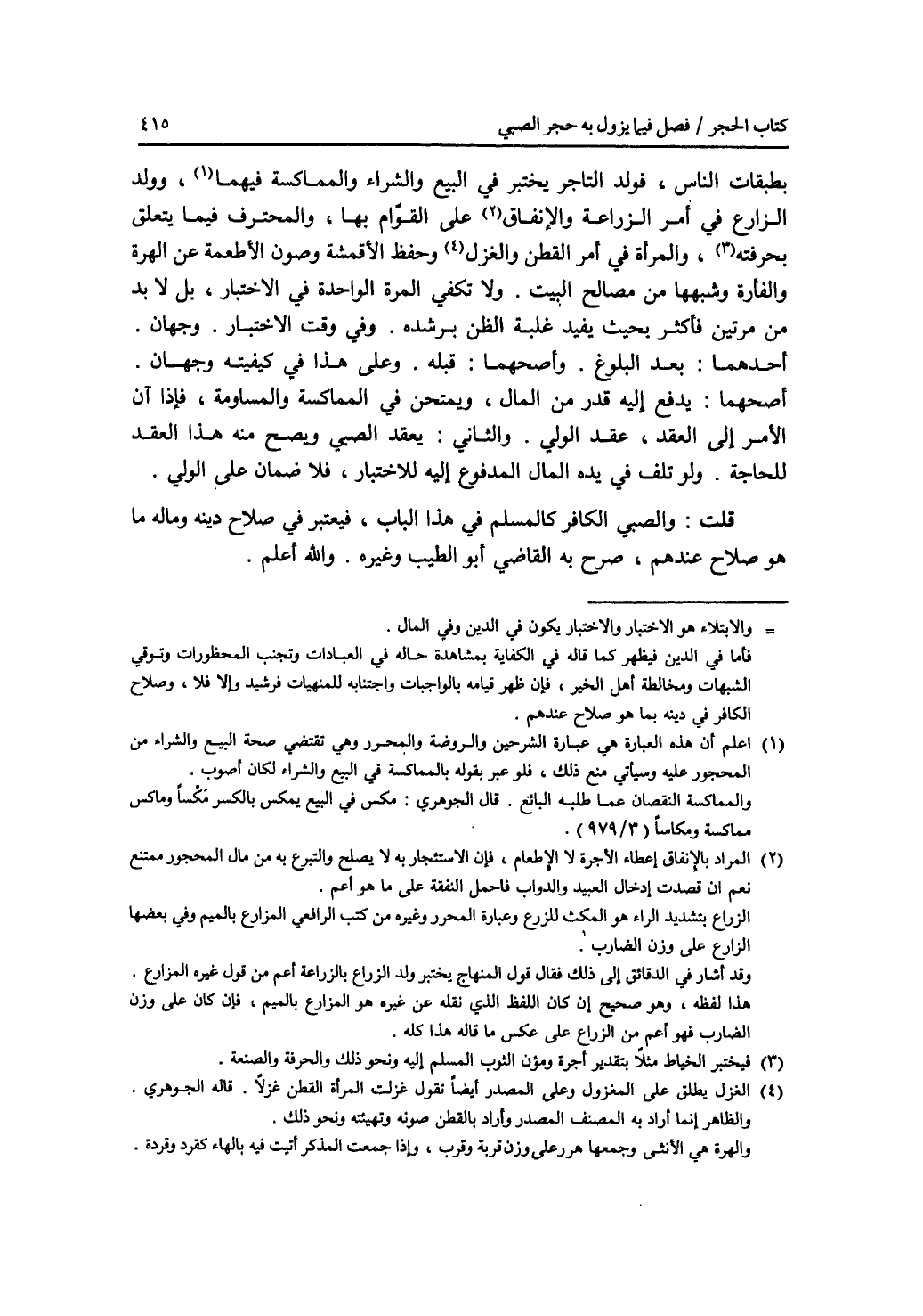بطبقات الناس، فولد التاجر يختبر في البيع والشراء والمماكسة فيهما، وولد الزارع في أمر الزراعة والانفاق على القوام بها، والمحترف فيما يتعلق بحرفته، والمرأة في أمر القطن والغزل وحفظ الاقمشة وصون الاطعمة عن الهرة والفأرة وشبهها من مصالح البيت. ولا تكفي المرة الواحدة في الاختبار، بل لا بد من مرتين فأكثر بحيث يفيد غلبة الظن برشده. وفي وقت الاختبار. وجهان. أحدهما: بعد البلوغ. وأصحهما: قبله. وعلى هذا في كيفيته وجهان. أصحهما: يدفع إليه قدر من المال، ويمتحن في المماكسة والمساومة. فإذا آن الامر إلى العقد، عقد الولي. والثاني: يعقد الصبي ويصح منه هذا العقد للحاجة. ولو تلف في يده المال المدفوع إليه للاختبار، فلا ضمان على الولي. قلت: والصبي الكافر كالمسلم في هذا الباب، فيعتبر في صلاح دينه وماله ما هو صلاح عندهم، وصرح به القاضي أبو الطيب وغيره. والله أعلم.