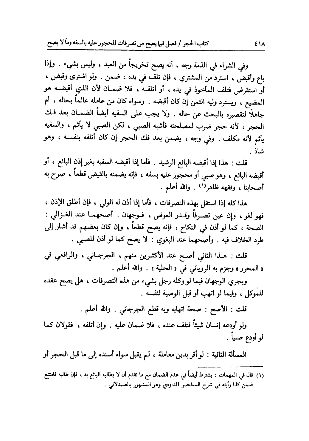 وفي الشراء في الذمة وجه، أنه يصح تخريجا من العبد، وليس بشئ. وإذا باع وأقبض، استرد من المشتري، فإن تلف في يده، ضمن. ولو اشترى وقبض، أو استقرض فتلف المأخوذ في يده، أو أتلفه، فلا ضمان لان الذي أقبضه هو المضيع، ويسترد وليه الثمن إن كان أقبضه. وسواء كان من عامله عالما بحاله، أم جاهلا لتقصيره بالبحث عن حاله. ولا يجب على السفيه أيضا الضمان بعد فك الحجر، لانه حجر ضرب لمصلحته فأشبه الصبي، لكن الصبي لا يأثم، والسفيه يأثم لانه مكلف. وفي وجه، يضمن بعد فك الحجر إن كان أتلفه بنفسه، وهو شاذ. قلت: هذا إذا أقبضه البائع الرشيد. فأما إذا أقبضه السفيه بغير إذن البائع، أو أقبضه البائع، وهو صبي أو محجور عليه بسفه، فإنه يضمنه بالقبض قطعا، صرح به أصحابنا وفقهه ظاهر. والله أعلم. هذا كله إذا استقل بهذه التصرفات، فأما إذا أذن له الولي، فإن أطلق الاذن، فهو لغو وإن عين تصرفا وقدر العوض، فوجهان. أصحهما عند الغزالي: الصحة، كما لو أذن في النكاح، فإنه يصح قطعا، وإن كان بعضهم قد أشار إلى طرد الخلاف فيه. وأصحهما عند البغوي: لا يصح كما لو أذن للصبي. قلت: هذا الثاني أصح عند الاكثرين منهم، الجرجاني، والرافعي في المحرر وجزم به الروياني في الحلية. والله أعلم. ويجري الوجهان فيما لو وكله رجل بشئ من هذه التصرفات، هل يصح عقده للموكل، وفيما لو اتهب أو قبل الوصية لنفسه. قلت: الاصح: صحة إتهابه وبه قطع الجرجاني. والله أعلم. ولو أودعه إنسان شيئا فتلف عنده، فلا ضمان عليه. وإن أتلفه، فقولان كما لو أودع صبيا. المسألة الثانية: لو أقر بدين معاملة، لم يقبل سواء أسنده إلى ما قبل الحجر أو