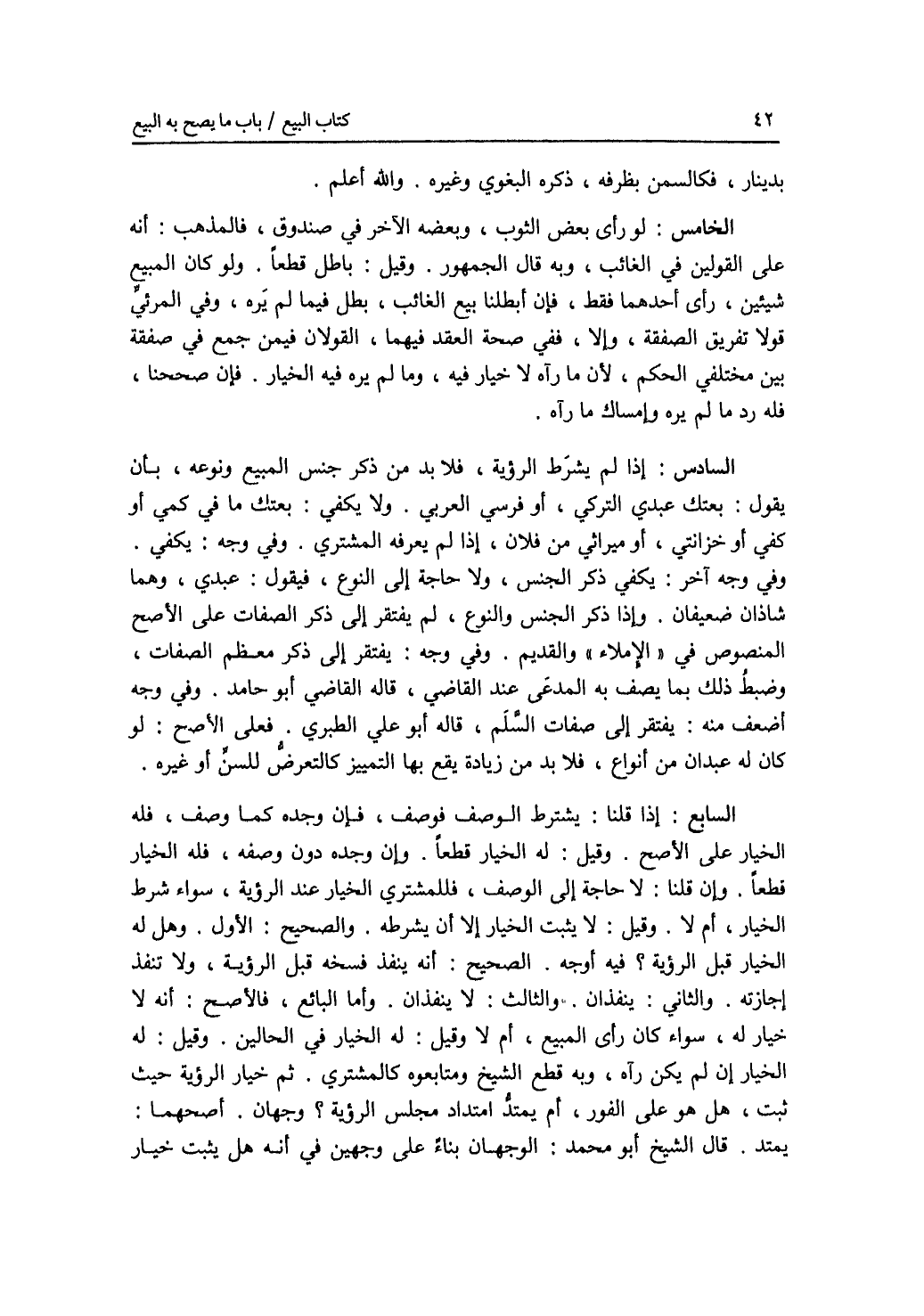 بدينار، فكالسمن بظرفه، ذكره البغوي وغيره. والله أعلم. الخامس: لو رأى بعض الثوب، وبعضه الآخر في صندوق، فالمذهب: أنه على القولين في الغائب، وبه قال الجمهور. وقيل: باطل قطعا. ولو كان المبيع شيئين، رأى أحدهما فقط، فإن أبطلنا بيع الغائب، بطل فيما لم يره، وفي المرئي قولا تفريق الصفقة، وإلا، ففي صحة العقد فيهما، القولان فيمن جمع في صفقة بين مختلفي الحكم، لان ما رآه لا خيار فيه، وما لم يره فيه الخيار. فإن صححنا، فله رد ما لم يره وإمساك ما رآه. السادس: إذا لم يشرط الرؤية، فلا بد من ذكر جنس المبيع ونوعه، بأن يقول: بعتك عبدي التركي، أو فرسي العربي. ولا يكفي: بعتك ما في كمي أو كفي أو خزانتي، أو ميراثي من فلان، إذا لم يعرفه المشتري. وفي وجه: يكفي. وفي وجه آخر: يكفي ذكر الجنس، ولا حاجة إلى النوع، فيقول: عبدي، وهما شاذان ضعيفان. وإذا ذكر الجنس والنوع، لم يفتقر إلى ذكر الصفات على الاصح المنصوص في الاملاء والقديم. وفي وجه: يفتقر إلى ذكر معظم الصفات، وضبط ذلك بما يصف به المدعى عند القاضي، قاله القاضي أبو حامد. وفي وجه أضعف منه: يفتقر إلى صفات السلم، قاله أبو علي الطبري. فعلى الاصح: لو كان له عبدان من أنواع، فلا بد من زيادة يقع بها التمييز كالتعرض للسن أو غيره. السابع: إذا قلنا: يشترط الوصف فوصف، فإن وجده كما وصف، فله الخيار على الاصح. وقيل: له الخيار قطعا. وإن وجده دون وصفه، فله الخيار قطعا. وإن قلنا: لا حاجة إلى الوصف، فللمشتري الخيار عند الرؤية، سواء شرط الخيار، أم لا. وقيل: لا يثبت الخيار إلا أن يشرطه. والصحيح: الاول. وهل له الخيار قبل الرؤية ؟ فيه أوجه. الصحيح: أنه يند فسخه قبل الرؤية، ولا تنفذ إجارته. والثاني: ينفذان. والثالث: لا ينفذان. وأما البائع، فالاصح: أنه لا خيار له، سواء كان رأى المبيع، أم لا. وقيل: له الخيار في الحالين. وقيل: له الخيار إن لم يكن رآه، وبه قطع الشيخ ومتابعوه كالمشتري. ثم خيار الرؤية حيث ثبت، هل هو على الفور، أم يمتد امتداد مجلس الرؤية ؟ وجهان. أصحهما: يمتد. قال الشيخ أبو محمد. الوجهان بناء على وجهين في أنه هل يثبت خيار
