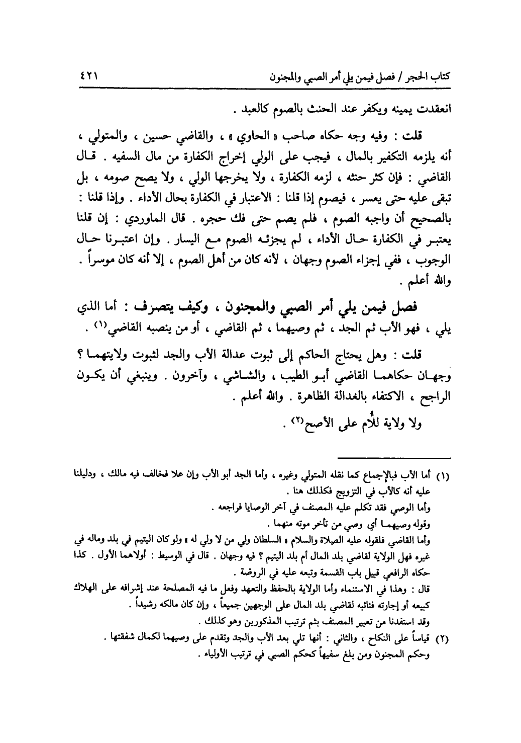 فصل فيمن يلي أمر الصبي والمجنون، وكيف يتصرف أما الذي يلي، فهو الاب ثم الجد، ثم وصيهما، ثم القاضي، أو من ينصبه القاضي. قلت: وهل يحتاج الحاكم إلى ثبوت عدالة الاب والجد لثبوت ولايتهما ؟ وجهان حكاهما القاضي أبو الطيب، والشاشي، وآخرون. وينبغي أن يكون الراجح، الاكتفاء بالعدالة الظاهرة. والله أعلم. ولا ولاية للام على الاصح.