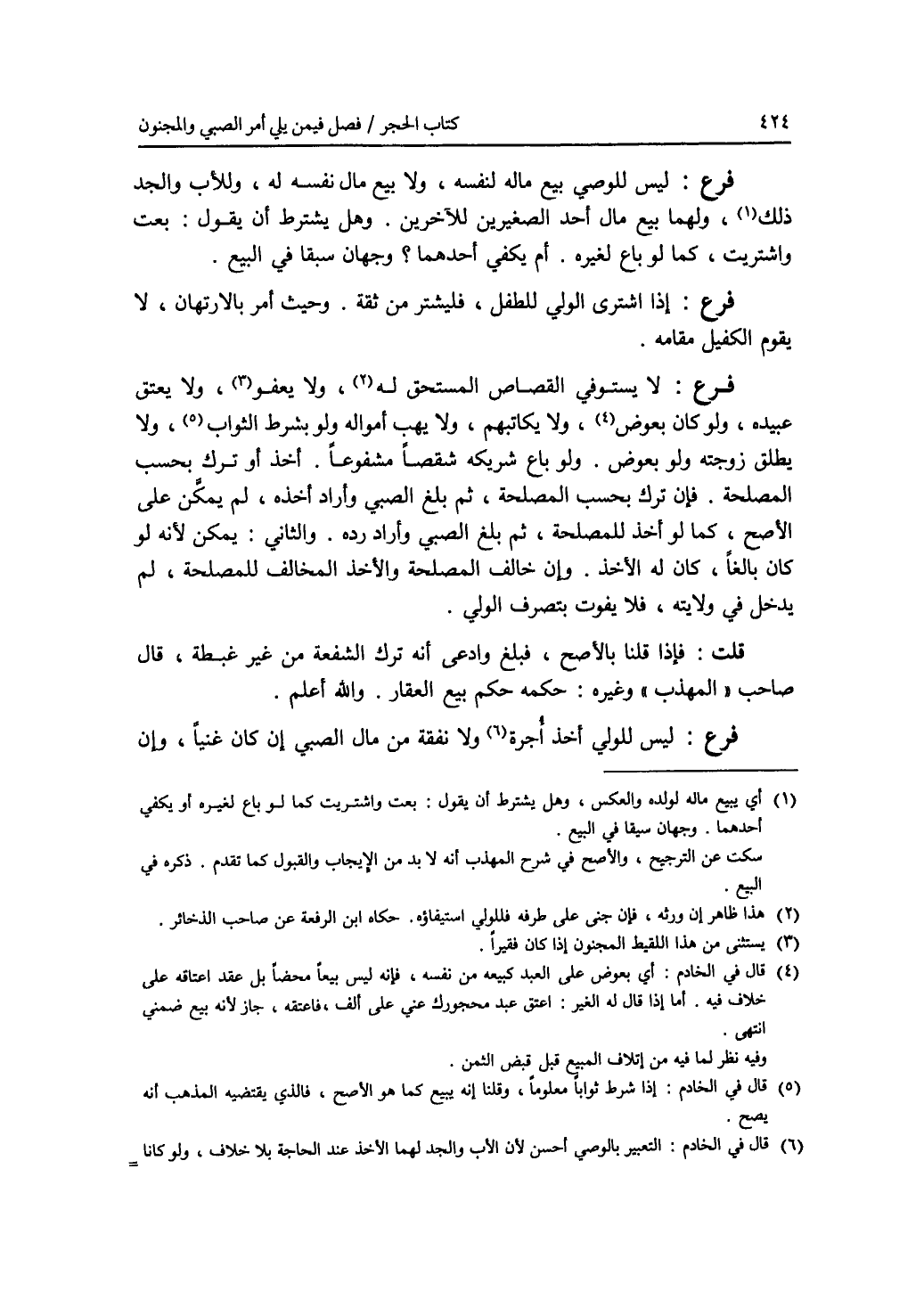 فرع ليس للوصي بيع ماله لنفسه، ولا بيع مال نفسه له، وللاب والجد ذلك، ولهما بيع مال أحد الصغيرين للآخر. وهل يشترط أن يقول: بعت واشتريت، كما لو باع لغيره. أم يكفي أحدهما ؟ وجهان سبقا في البيع. فرع إذا اشترى الولي للطفل، فليشتر من ثقة. وحيث أمر بالارتهان، لا يقوم الكفيل مقامه. فرع لا يستوفى القصاص المستحق له، ولا يعفو، ولا يعتق عبيده، ولو كان بعوض، ولا يكاتبهم، ولا يهب أمواله ولو بشرط الثواب، ولا يطلق زوجته ولو بعوض. ولو باع شريكه شقصا مشفوعا، أخذ أو ترك بحسب المصلحة. فإن ترك بحسب المصلحة، ثم بلغ الصبي وأراد أخذه، لم يمكن على الاصح، كما لو أخذ للمصلحة، ثم بلغ الصبي وأرادرده. والثاني: يمكن لانه لو كان بالغا، كان له الاخذ. وإن خالف المصلحة والآخذ المخالف للمصلحة، لم يدخل في ولايته، فلا يفوت بتصرف الولي. قلت: فإذا قلنا بالاصح، فبلغ وادعى أنه ترك الشفعة من غير غبطة، قال صاحب المهذ ب وغيره: حكمه حكم بيع العقار. والله أعلم. فرع ليس للولي أخذ أجرة ولا نفقة من مال الصبي إن كان غنيا، وإن