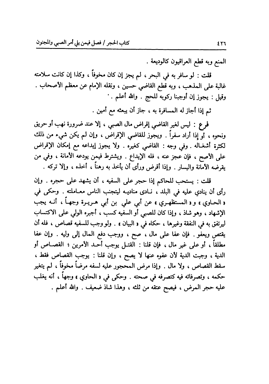 المنع وبه قطع العراقيون كالوديعة. قلت: لو سافر به في البحر، لم يجز إن كان مخوفا، وكذا إن كانت سلامته غالبة على المذهب، وبه قطع القاضي حسين، ونقله الامام عن معظم الاصحاب. وقيل: يجوز إن أوجبنا ركوبه للحج. والله أعلم. ثم إذا أجاز له المسافرة به، جاز أن يبعثه مع أمين. فرع ليس لغير القاضي إقراض مال الصبي، إلا عند ضرورة نهب أو حريق ونحوه، أو إذا أراد سفرا. ويجوز للقاضي الاقراض، وإن لم يكن شئ من ذلك لكثرة أشغاله. وفي وجه: القاضي كغيره. ولا يجوز إيداعه مع إمكان الاقراض على الاصح، فإن عجز عنه، فله الايداع. ويشترط فيمن يودعه الامانة، وفي من يقرضه الامانة واليسار. وإذا أقرض ورأى أن يأخذ به رهنا، أخذه، وإلا تركه. قلت: يستحب للحاكم إذا حجر على السفيه، أن يشهد على حجره. وإن رأى أن ينادي عليه في البلد، نادى مناديه ليتجنب الناس معاملته. وحكى في الحاوي والمستظهري عن أبي علي ابن أبي هريرة وجها، أنه يجب الاشهاد، وهو شاذ. وإذا كان للصبي أو السفيه كسب، أجبره الولي على الاكتساب ليرتفق به في النفقة وغيرها، حكاه في البيان. ولو وجب للسفيه قصاص، فله أن يقتص ويعفو. فإن عفا على مال، صح، ووجب دفع المال إلى وليه. وإن عفا مطلقا، أو على غير مال، فإن قلنا: القتل يوجب أحد الامرين: القصاص أو الدية، وجبت الدية لان عفوه عنها لا يصح، وإن قلنا: يوجب القصا ص فقط، سقط القصاص، ولا مال. وإذا مرض المحجور عليه لسفه مرضا مخوفا، لم يتغير حكمه، وتصرفاته فيه كتصرفه في صحته. وحكى في الحاوي وجها، أنه يغلب عليه حجر المرض، فيصح عتقه من ثلثه، وهذا شاذ ضعيف. والله أعلم.
