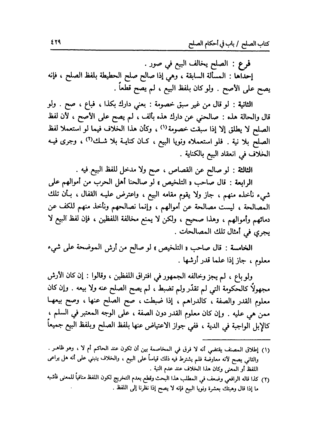 فرع الصلح يخالف البيع في صور. إحداها: المسألة السابقة، وهي إذا صالح صلح الحطيطة بلفظ الصلح، فإنه يصح على الاصح. ولو كان بلفظ البيع، لم يصح قطعا. الثانية: لو قال من غير سبق خصومة: بعني دارك بكذا، فباع، صح. ولو قال والحالة هذه: صالحني عن دارك هذه بألف، لم يصح على الاصح، لان لفظ الصلح لا يطلق إلا إذا سبقت خصومة، وكأن هذا الخلاف فيما لو استعملا لفظ الصلح بلا نية. فلو استعملاه ونويا البيع، كان كناية بلا شك، وجرى فيه الخلاف في انعقاد البيع بالكناية. الثالثة: لو صالح عن القصاص، صح ولا مدخل للفظ البيع فيه. الرابعة: قال صاحب التلخيص لو صالحنا أهل الحرب من أموالهم على شئ نأخذه منهم، جاز ولا يقوم مقامه البيع، واعترض عليه القفال، بأن تلك المصالحة، ليست مصالحة عن أموالهم وإنما نصالحهم ونأخذ منهم للكف عن دمائهم وأموالهم، وهذا صحيح، ولكن لا يمنع مخالفة اللفظين، فإن لفظ البيع لا يجري في أمثال تلك المصالحات. الخامسة: قال صاحب التلخيص لو صالح من إرش الموضحة على شئ معلوم، جاز إذا علما قدر أرشها. ولو باع، لم يجز وخالفه الجمهور في افتراق اللفظين، وقالوا: إن كان الارش مجهولا كالحكومة التي لم تقدر ولم تضبط، لم يصح الصلح عنه ولا بيعه. وإن كان معلوم القدر والصفة، كالدراهم، إذا ضبطت، صح الصلح عنها، وصح بيعها ممن هي عليه. وإن كان معلوم القدر دون الصفة، على الوجه المعتبر في السلم، كالابل الواجبة في الدية، ففي جواز الاعتياض عنها بلفظ الصلح وبلفظ البيع جميعا