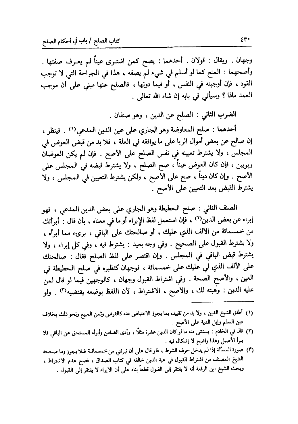 وجهان. ويقال: قولان. أحدهما: يصح كمن اشترى عينا لم يعرف صفتها. وأصحهما: المنع كما لو أسلم في شئ لم يصفه، هذا في الجراحة التي لا توجب القود، فإن أوجبته في النفس، أو فيما دونها، فالصلح عنها مبني على أن موجب العمد ماذا ؟ وسيأتي في بابه إن شاء الله تعالى. الضرب الثاني: الصلح عن الدين، وهو صنفان. أحدهما: صلح المعاوضة وهو الجاري على عين الدين المدعى. فينظر، إن صالح عن بعض أموال الربا على ما يوافقه في العلة، فلا بد من قبض العوض في المجلس، ولا يشترط تعيينه في نفس الصلح على الاصح. فإن لم يكن العوضان ربويين، فإن كان العوض عينا، صح الصلح، ولا يشترط قبضه في المجلس على الاصح. وإن كان دينا، صح على الاصح، ولكن يشترط التعيين في المجلس، ولا يشترط القبض بعد التعيين على الاصح. الصنف الثاني: صلح الحطيط وهو الجاري على بعض الدين المدعى، فهو إبراء عن بعض الدين، فإن استعمال لفظ الابراء أو ما في معناه، بأن قال: أبرأتك من خمسمائة من الالف الذي عليك، أو صالحتك على الباقي، برئ مما أبرأه، ولا يشترط القبول على الصحيح. وفي وجه بعيد: يشترط فيه، وفي كل إبراء، ولا يشترط قبض الباقي في المجلس. وإن اقتصر على لفظ الصلح فقال: صالحتك على الالف الذي لي عليك على خمسمائة، فوجهان كنظيره في صلح الحطيطة في العين، والاصح الصحة. وفي اشتراط القبول وجهان، كالوجهين فيما لو قال لمن عليه الدين: وهبته لك. والاصح، الاشتراط، لان اللفظ بوضعه يقتضيه. ولو